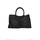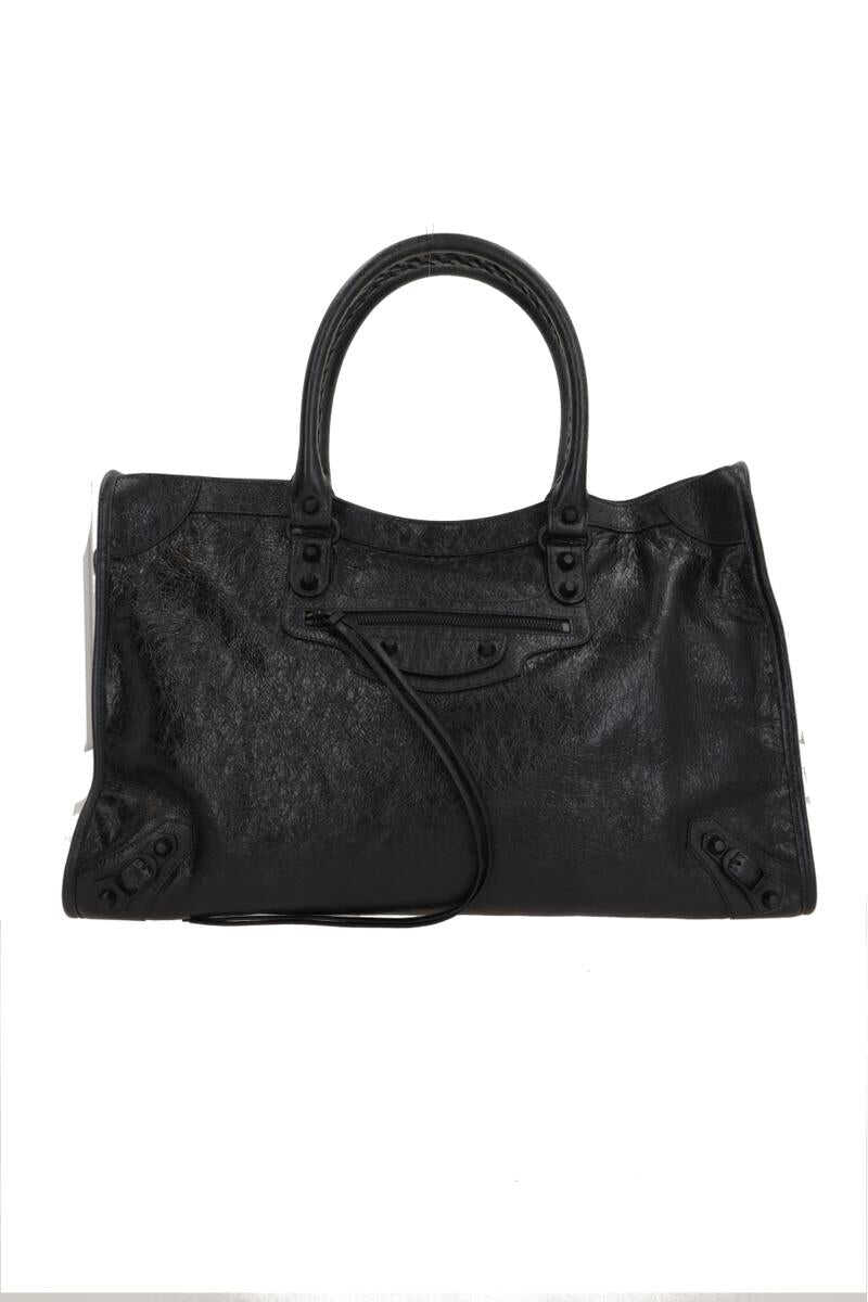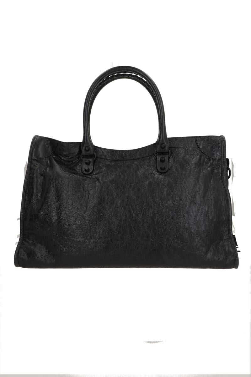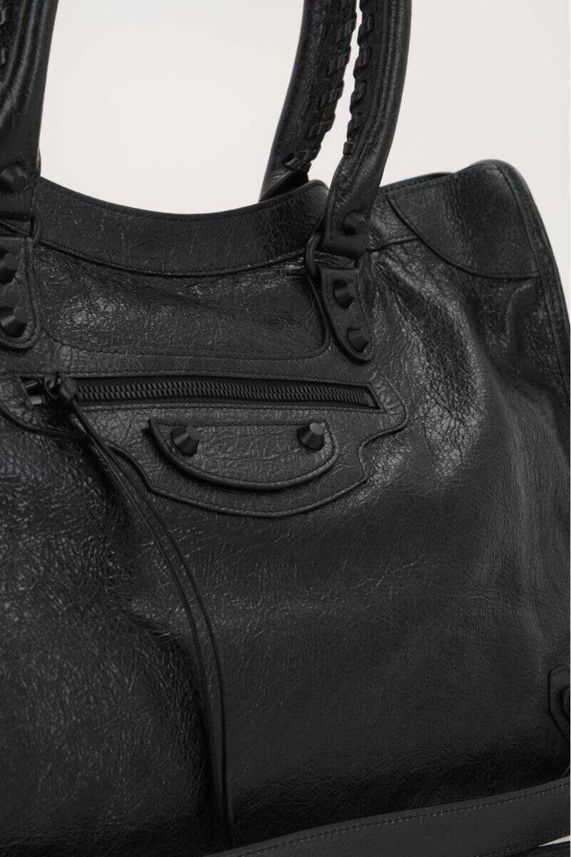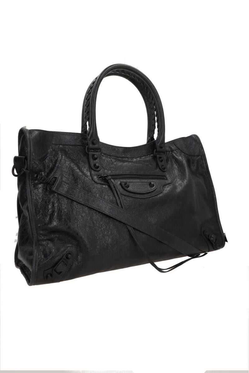Balenciaga tote bag crafted from black Arena Storico leather, embellished with matte black metal studs and buckles. Featuring a zip closure, double handles, and an adjustable/removable shoulder strap. The black canvas-lined interior is equipped with a zip pocket, while a front zip pocket completes the design.