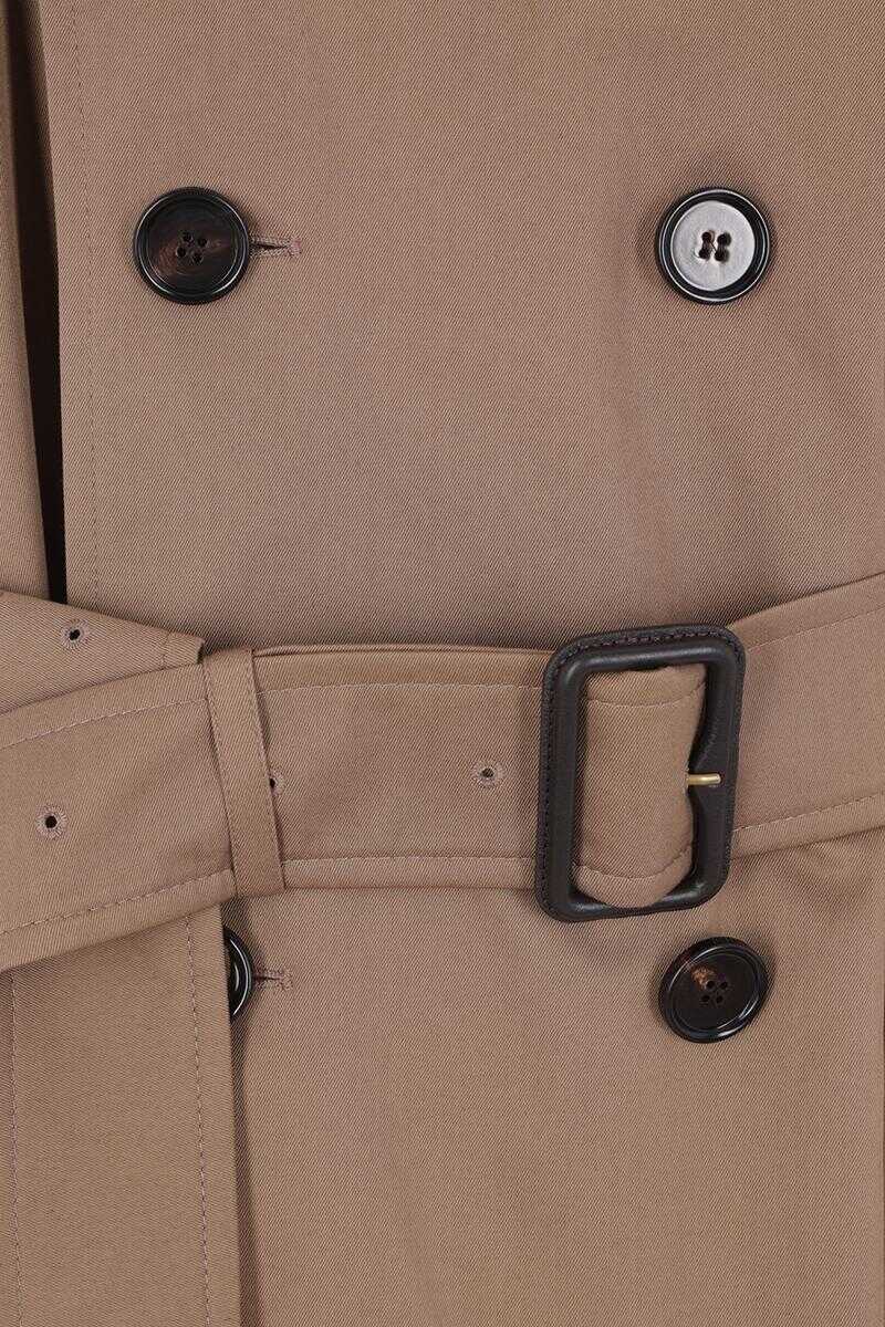 Burberry double-breasted trench coat made of clay brown cotton gabardine, featuring a removable belt. Designed with wide lapels, button closure, shoulder epaulettes, long sleeves with wrist straps, welt pockets, storm flap, and a central back vent. The interior is lined with Burberry Check cotton fabric.