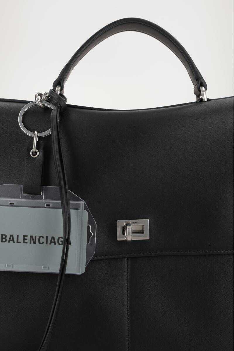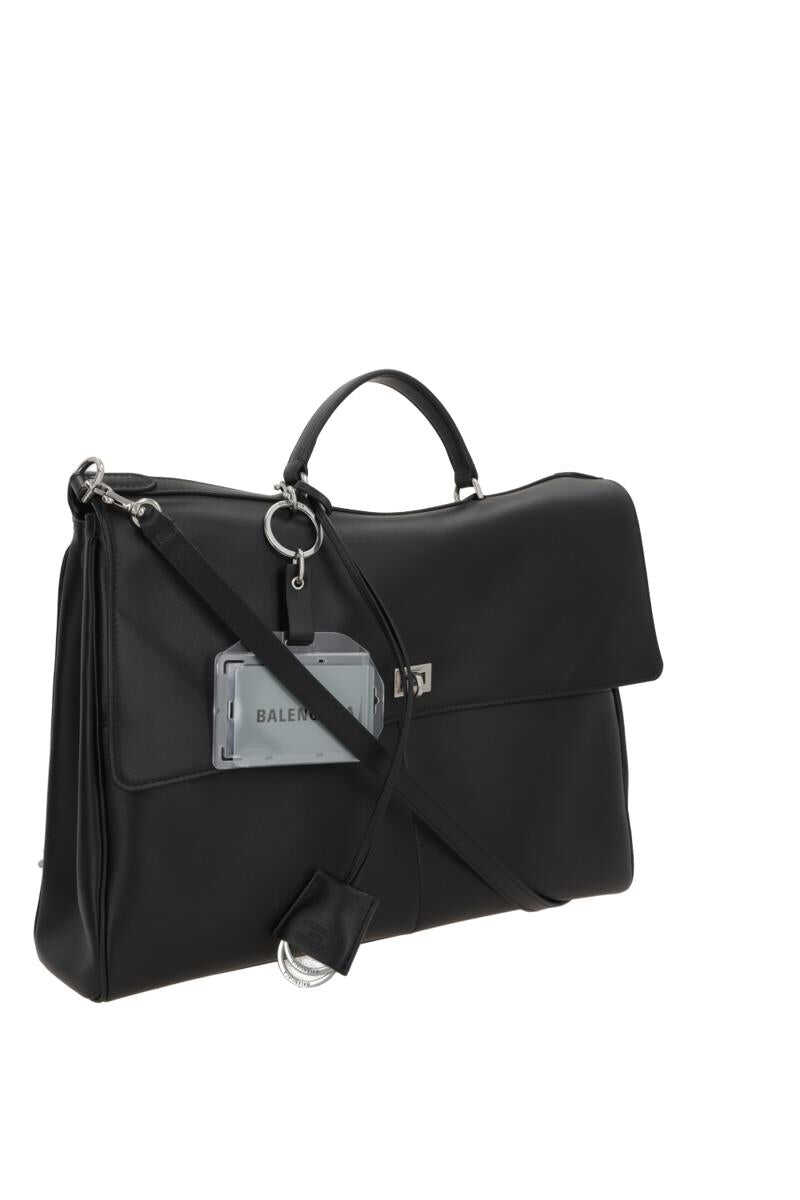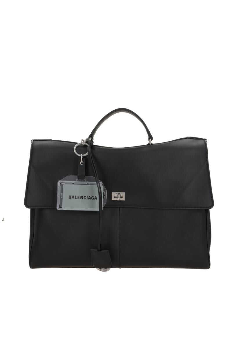 Balenciaga business bag made of smooth black leather. Featuring antiqued silver-tone hardware, a turn-lock closure on the flap, top handle, and dual shoulder straps. The interior, lined in tone-on-tone nappa leather, is equipped with multiple pockets. The design is completed with a back zip pocket, a removable key holder with double spiral ring, and a badge holder.
