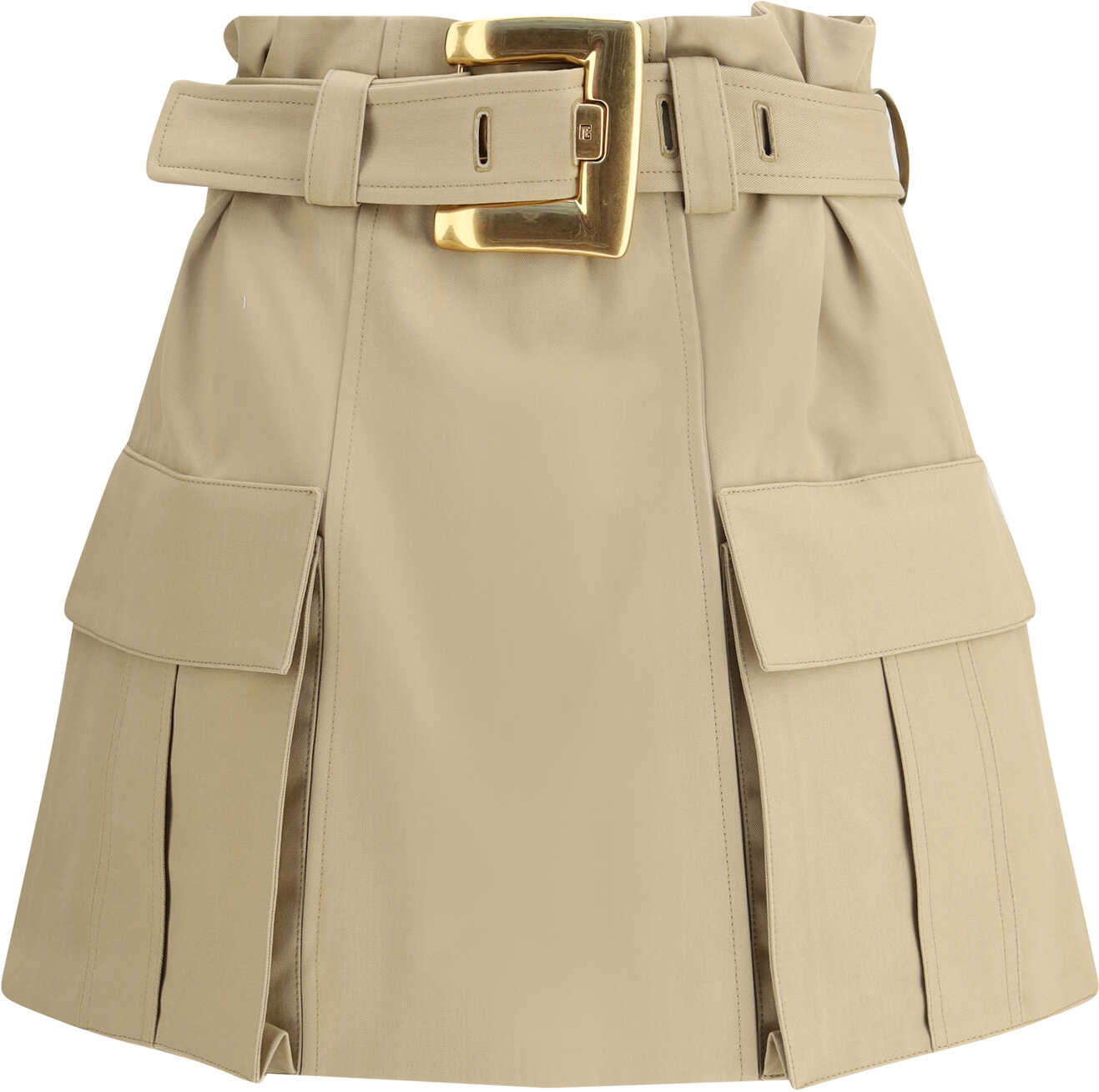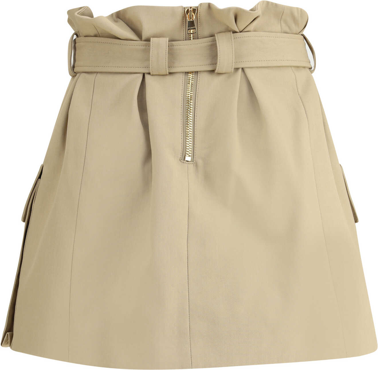 Balmain's cargo Miniskirt reinterprets utility style with a sophisticated twist. Featuring a removable belt with a PB engraved gold metal Anthem buckle, it has two side pockets with gussets and a flap. The back closure with exposed zipper and Balmain engraved slider adds a bold iconic detail to the design.
