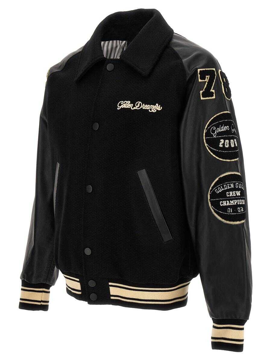 'Foxy' wool cloth bomber jacket with all-over patches, long leather sleeves with knitted cuffs, pockets, button closure