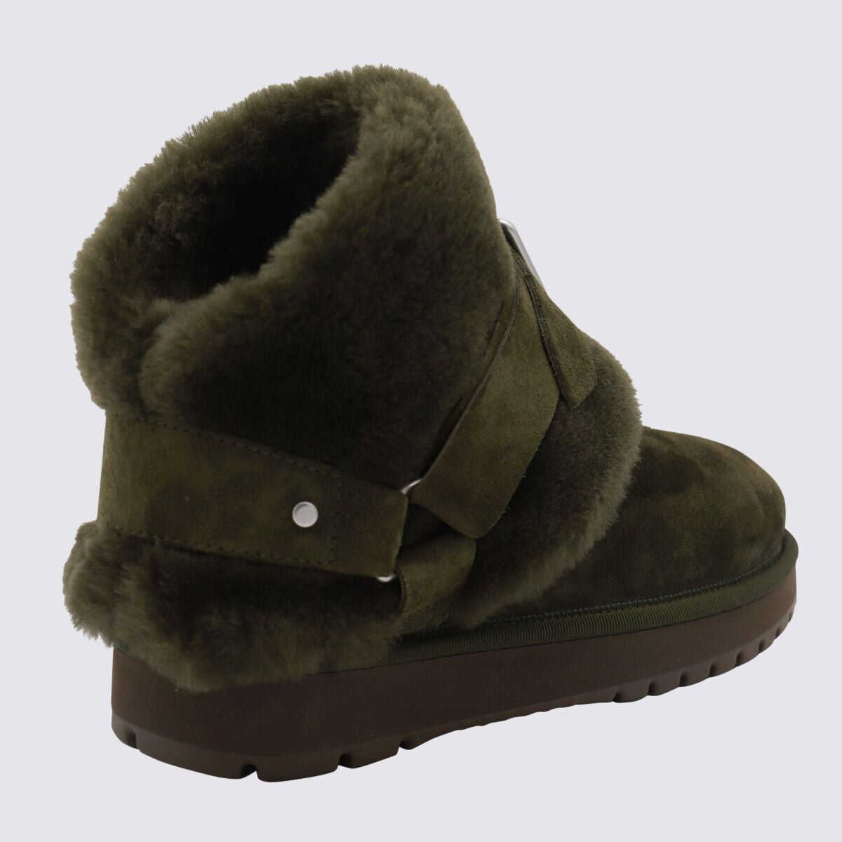 Brown sheep boots from Burberry featuring round toe, frontal buckle, sheep and leather sole.