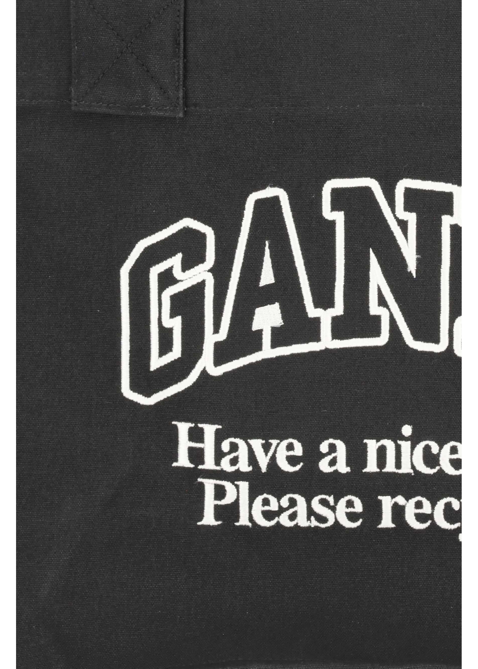 Ganni's Logo canvas Tote Bag combines practicality with a responsible spirit. Made with 100% recycled cotton lining, it features top handles and a roomy compartment, ideal for everyday use. The GANNI logo is accompanied by the message "Have a nice day! Please recycle," reflecting the brand's commitment to sustainability. Completing the design is an interior zippered pocket, perfect for storing smaller items.