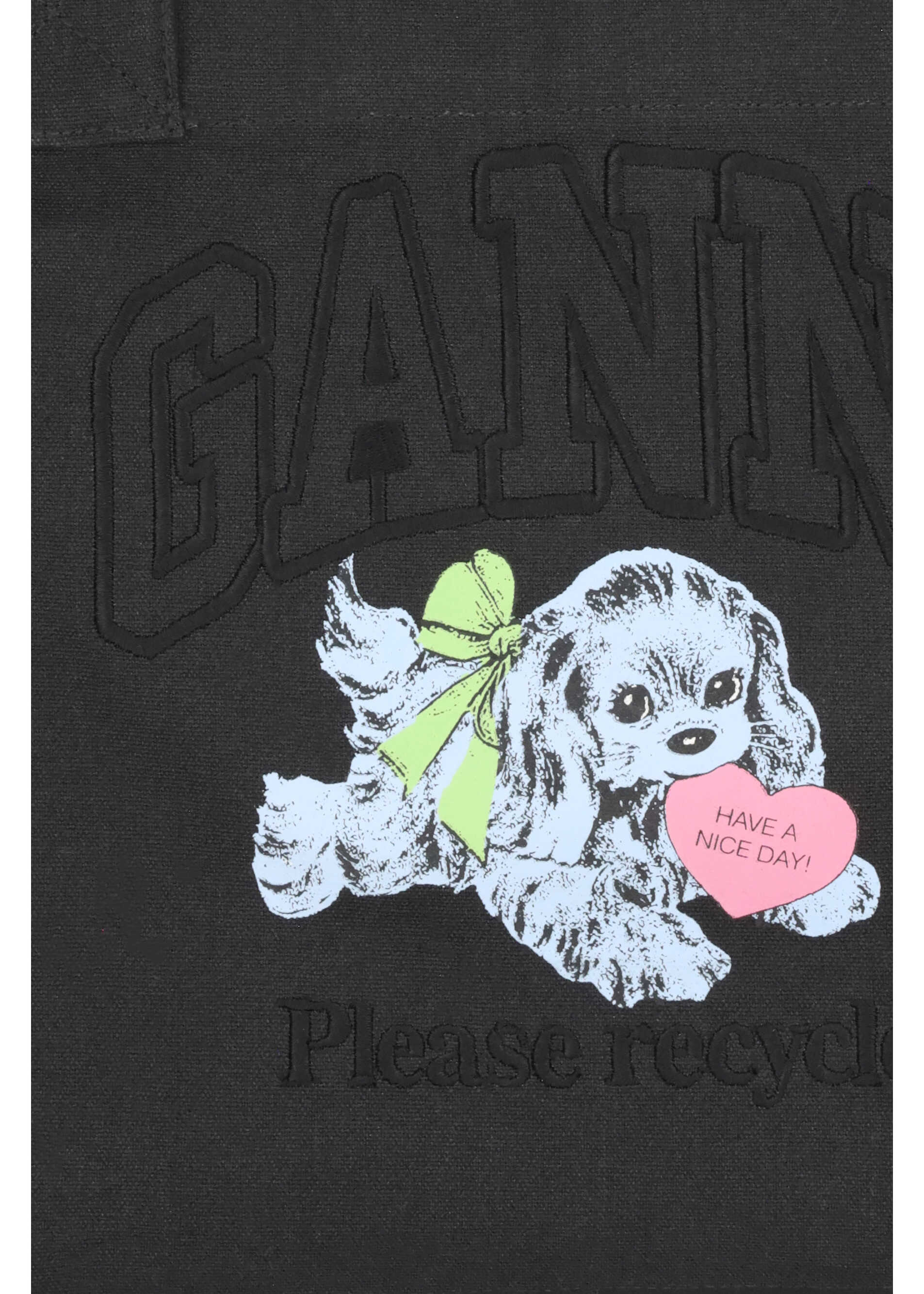 Ganni's Puppy Tote Bag is a fun and roomy accessory perfect for everyday use. Featuring graphics with adorable puppies, it features top handles for convenient carrying. The embroidered GANNI logo adds a distinctive touch, while the interior offers a spacious compartment and a zippered pocket to keep essentials tidy at all times.