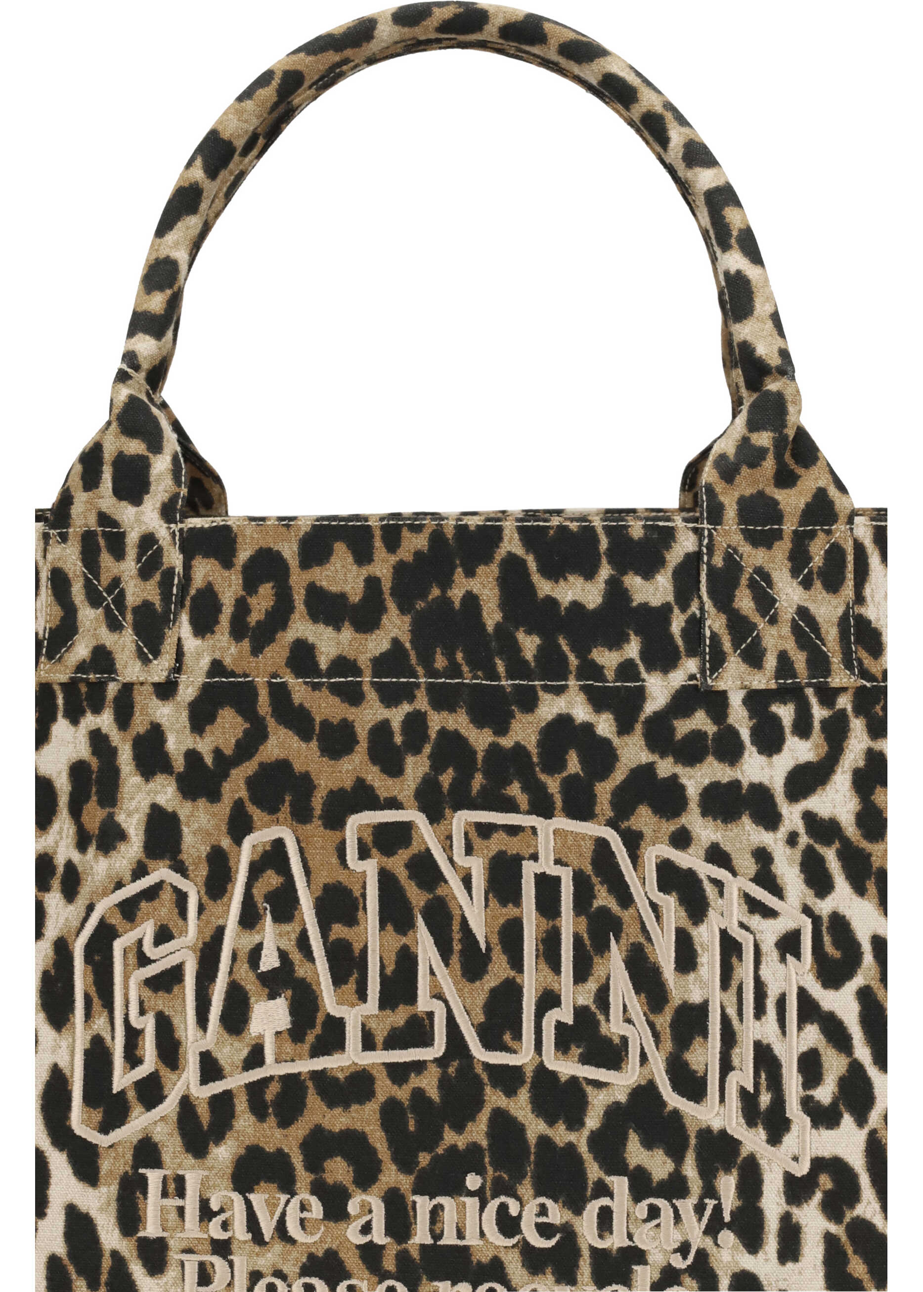Ganni's XXL Leopard Tote Bag combines bold design with everyday practicality. Featuring top handles for easy carrying, it has a large interior compartment and a zippered pocket for essentials. The leopard print is embellished with the message "Have a nice day! Please recycle," while the GANNI logo adds a distinctive, contemporary detail.