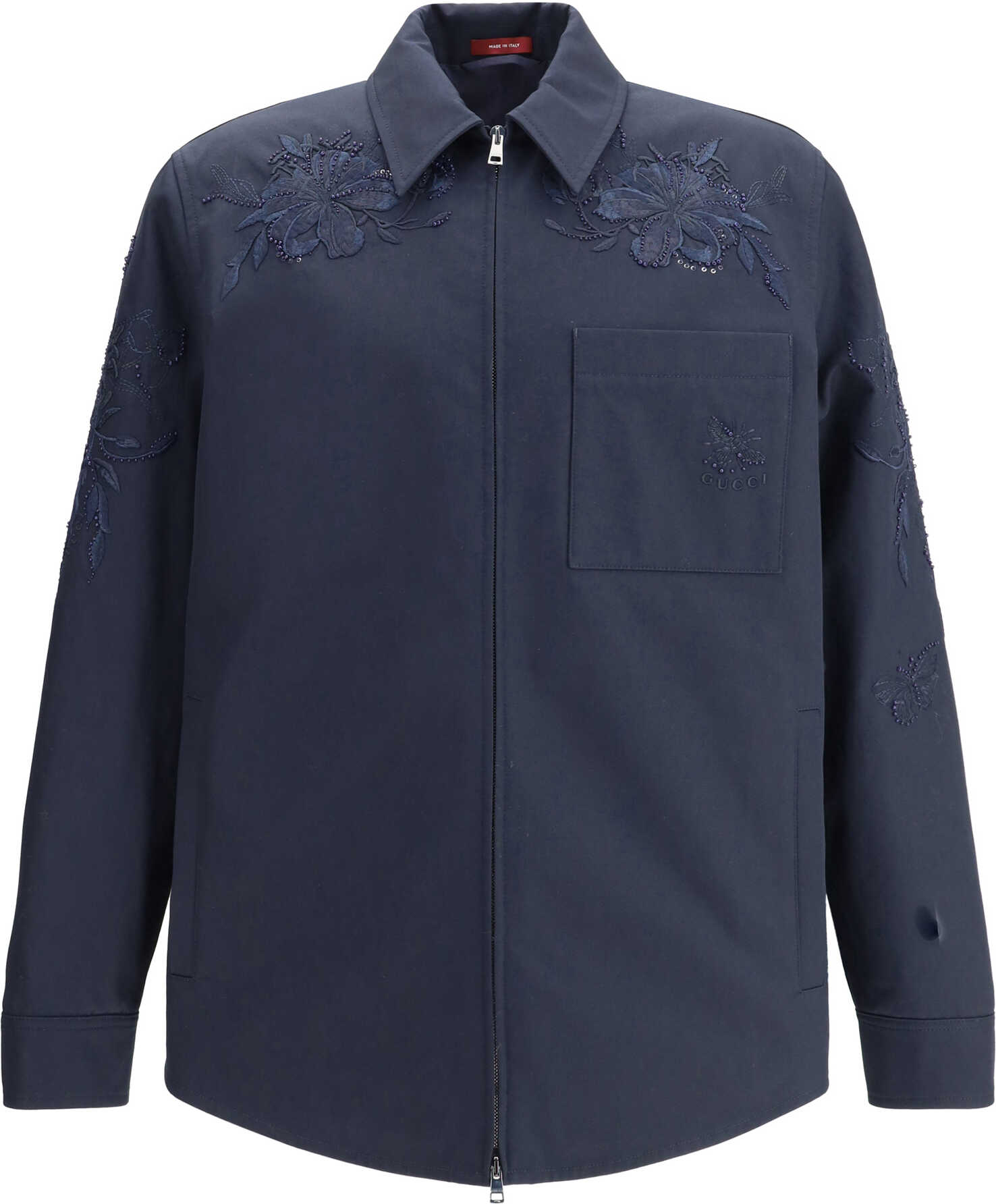 Gucci's cotton Jacket with embroidery is made of black cotton twill, featuring a Web detail on the back and an embossed Gucci logo to highlight its identity. It features a pointed collar, functional front pockets and long sleeves, while the front zipper closure ensures practicality. A half lining completes the garment to ensure comfort and lightness.