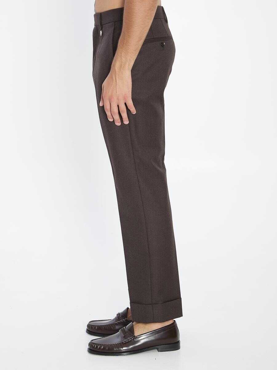 Tailored trousers in brown wool. They feature a zip, hook, and button closure, Equestrian Knight Design detail on the belt loop, two front inset pockets, two back welt pockets with button, and belt loops. Comfortable fit.