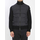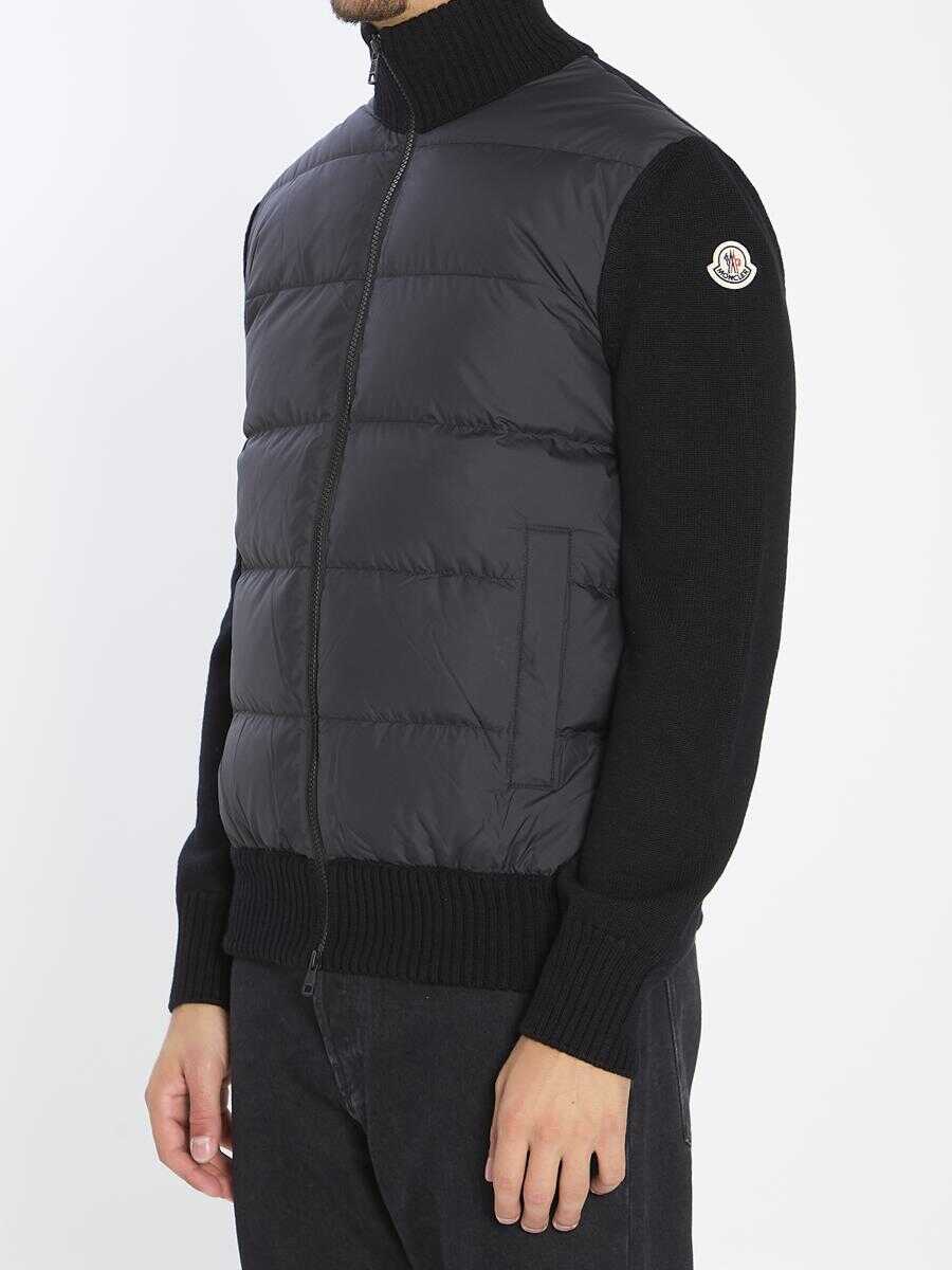 Black cardigan with padded front and knitted matt back. Features a ribbed high collar, front zip closure, two front pockets with buttons, ribbed cuffs and hem, and a logo patch on the sleeve. Regular fit.