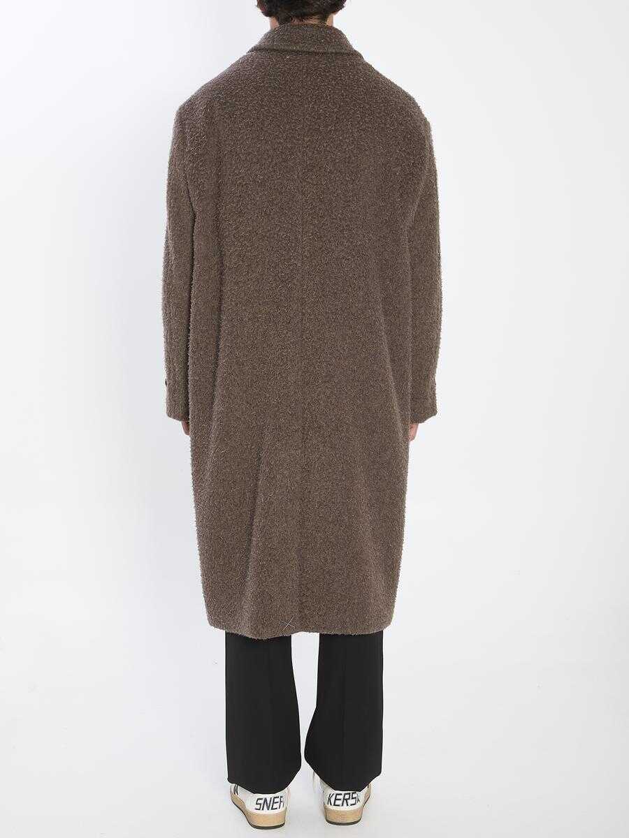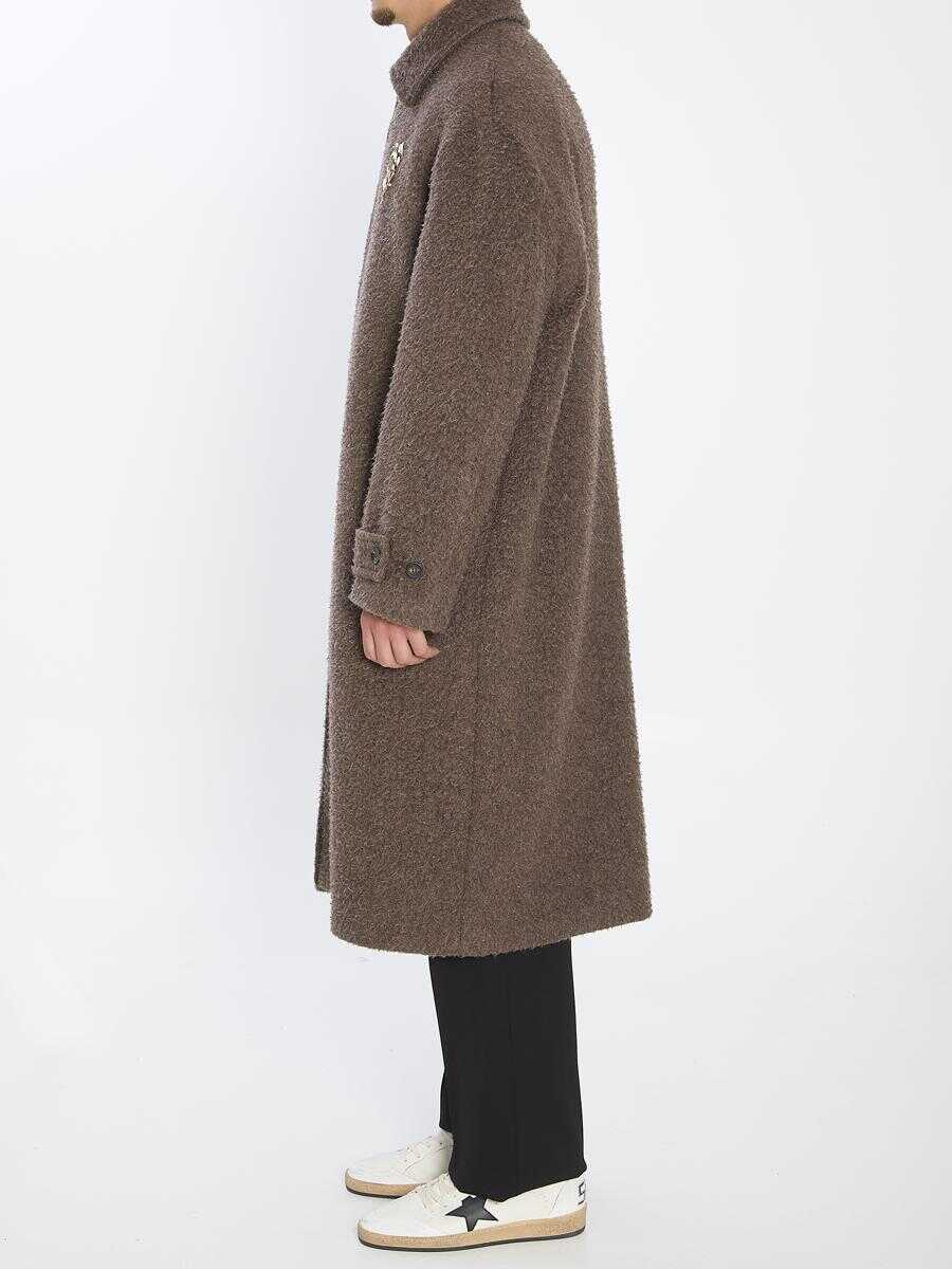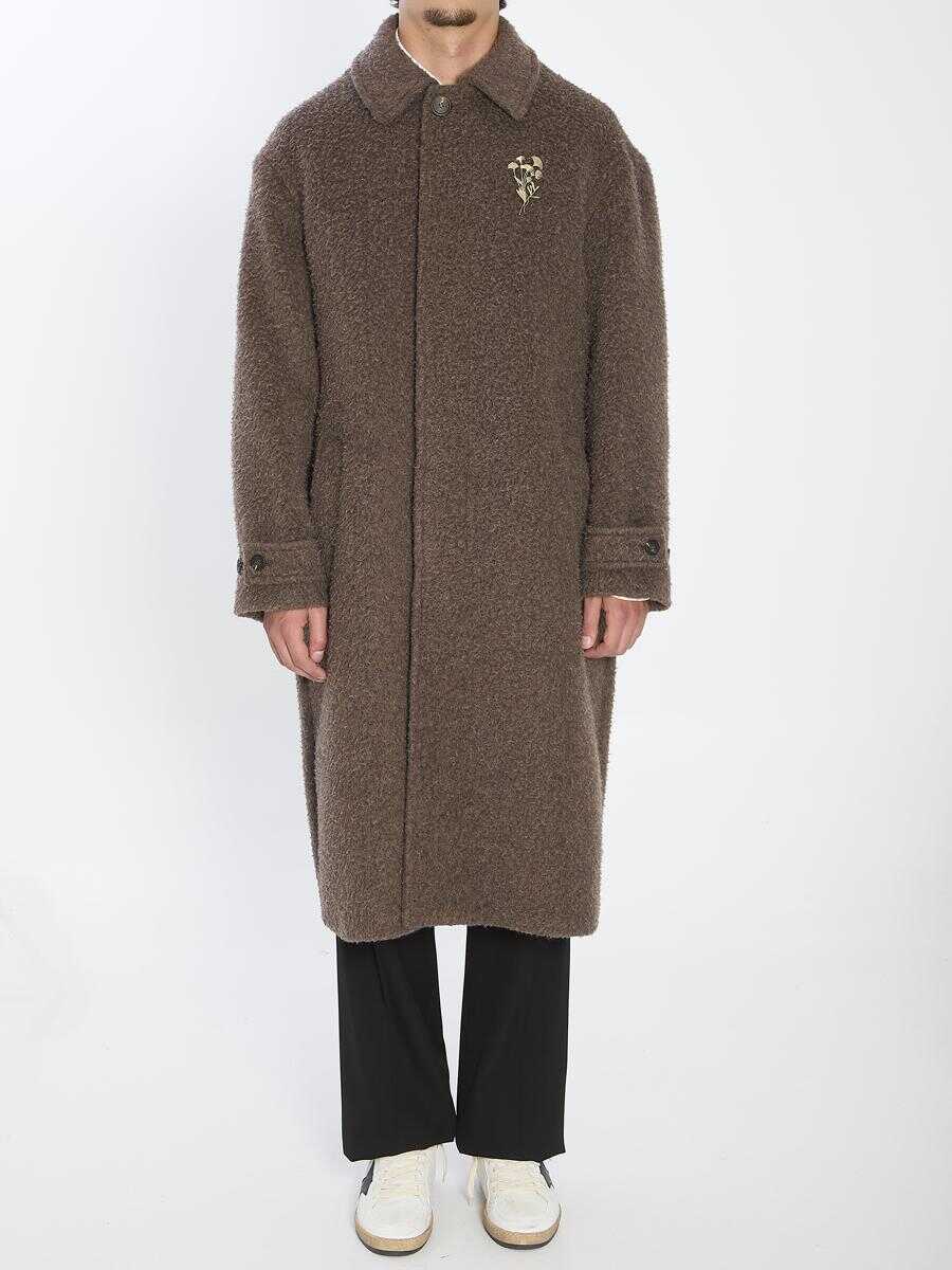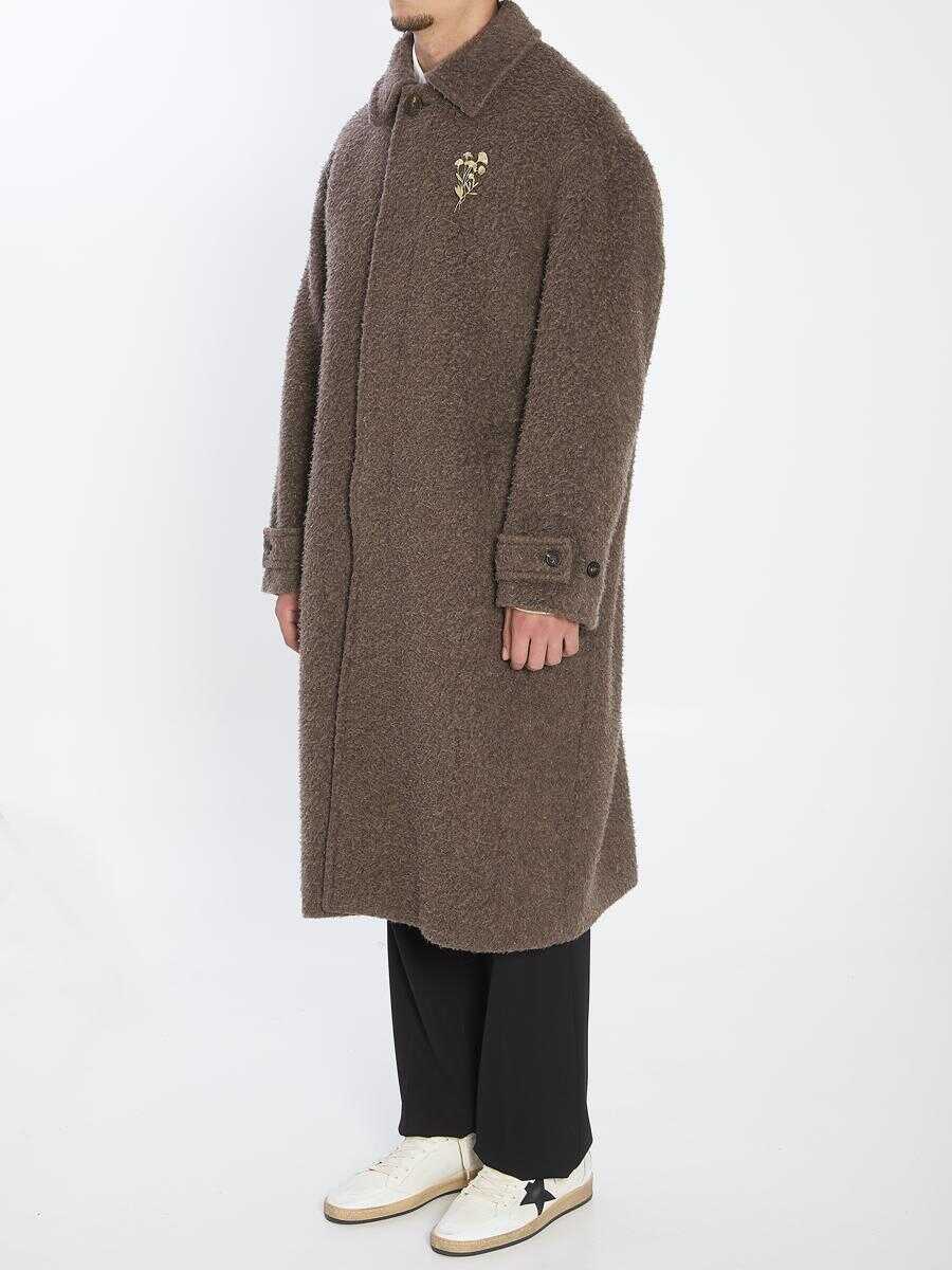 Coat in a wrinkle-effect wool blend in brown color. It features a pointed collar, single-breasted cut, concealed front button closure, a floral pin on the chest, adjustable buttoned cuffs, back vent, and iconic stars on the back. Regular fit.