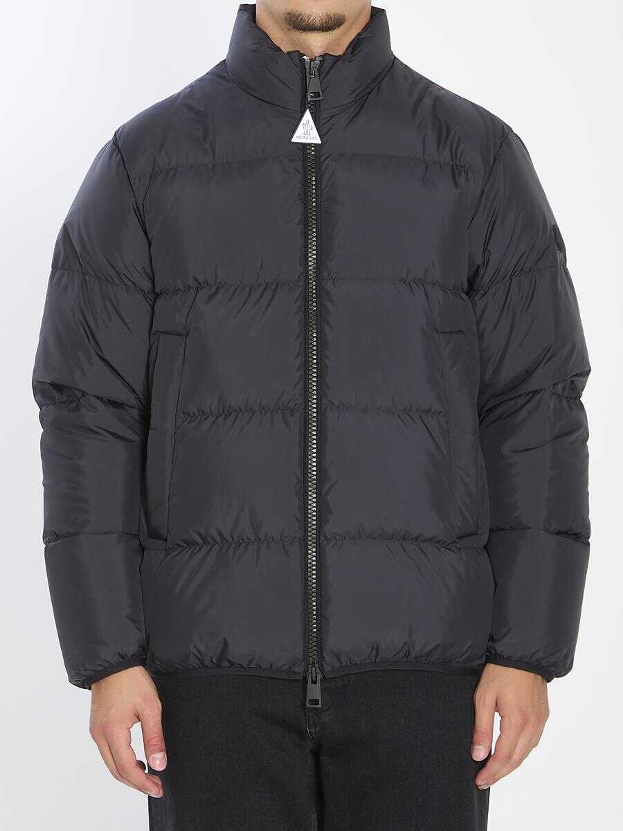 Matt Black black polyester puffer jacket. Features a crater collar, front personalized zip closure, two front pockets with buttons, and a logo patch on the sleeve. Regular fit.