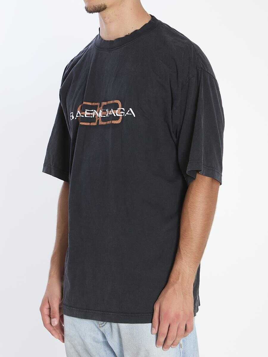 Black cotton T-shirt with delavé faded effect. Features ribbed crew neck, ribbed sleeves, BB Balenciaga print on the front. Crinkled effect. Oversized fit.