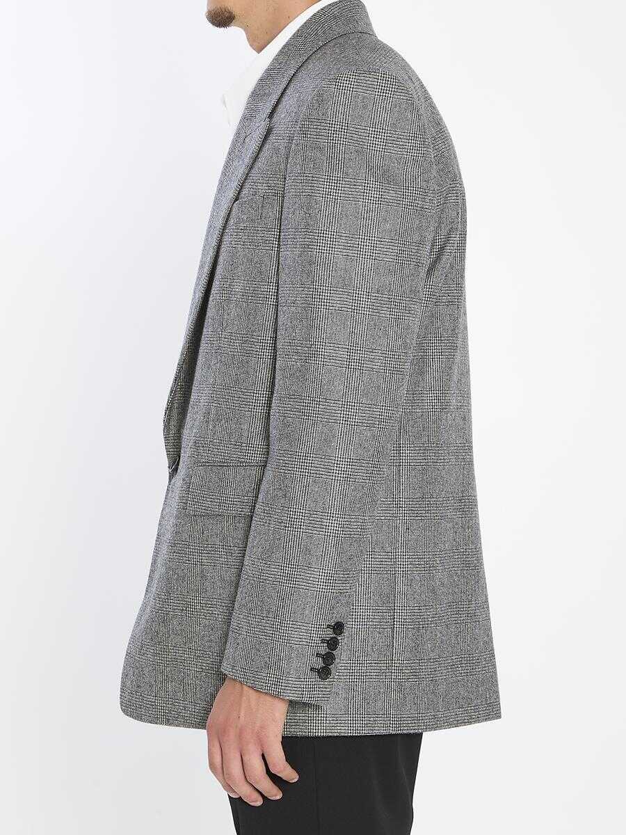 Single-breasted wool flannel jacket with black and white Prince of Wales pattern. Features notch lapels, one-button closure, two welt pockets with flaps on the front, a piped chest pocket, buttons on the cuffs, and a vent at the back. Relaxed elongated fit.