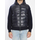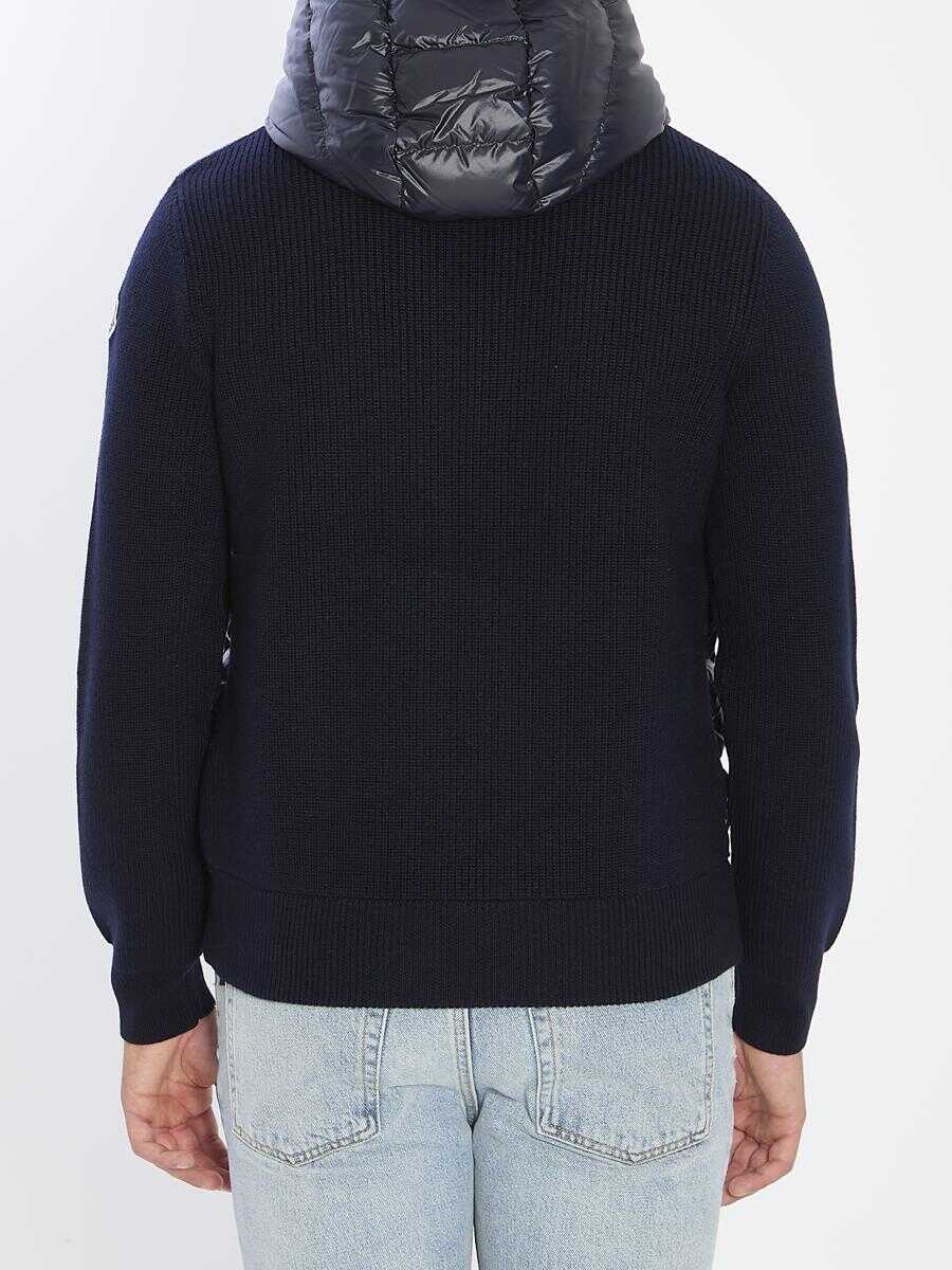 Dark shiny blue cardigan with a padded front and knitted back. Features a hood, front zip closure, two front pockets with buttons, ribbed cuffs and hem, and a logo patch on the sleeve. Regular fit.