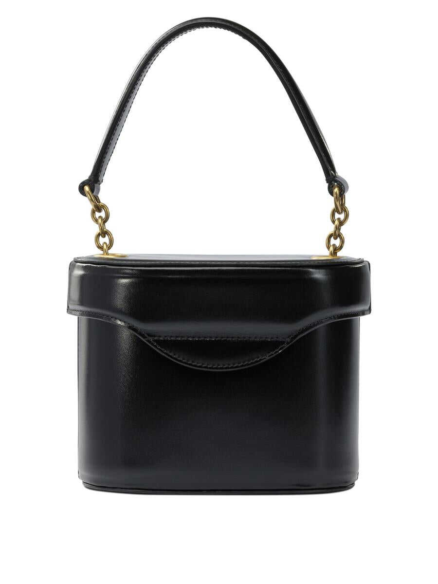 Valentino Garavani "Vain" vanity bag with glossy calfskin rigid construction and essential profile. Central VLogo Signature metal element integrated into the magnetic closure with antique brass finish. Rectangular silhouette is defined by a removable top handle and removable chain with width for hand-held or cross-body use. Smooth nappa leather interior lining with integrated flat pocket.