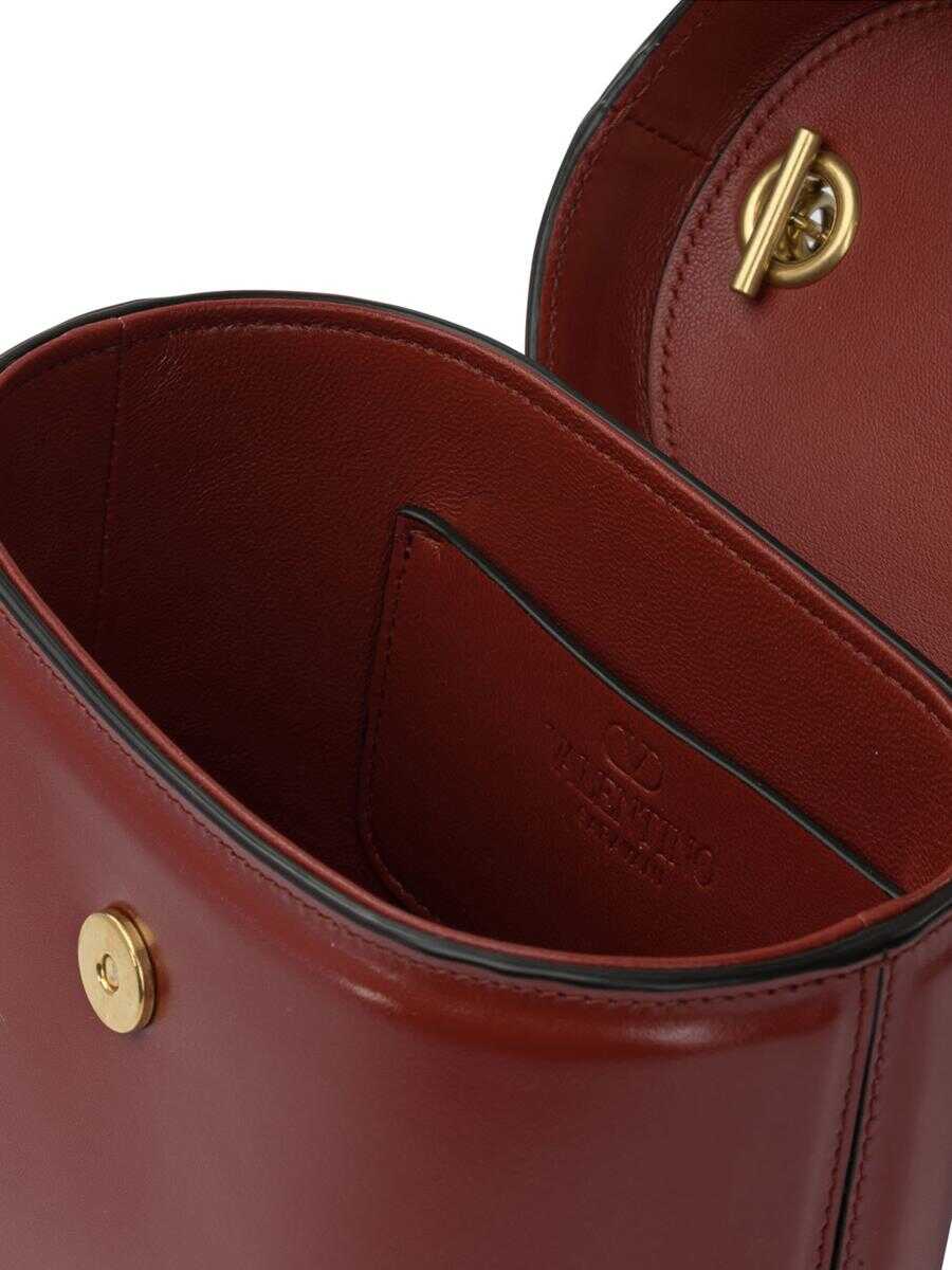 Valentino Garavani "Vain" vanity bag with glossy calfskin rigid construction and essential profile. Central VLogo Signature metal element integrated into the magnetic closure with antique brass finish. Rectangular silhouette is defined by a removable top handle and removable chain with width for hand-held or cross-body use. Smooth nappa leather interior lining with integrated flat pocket.
