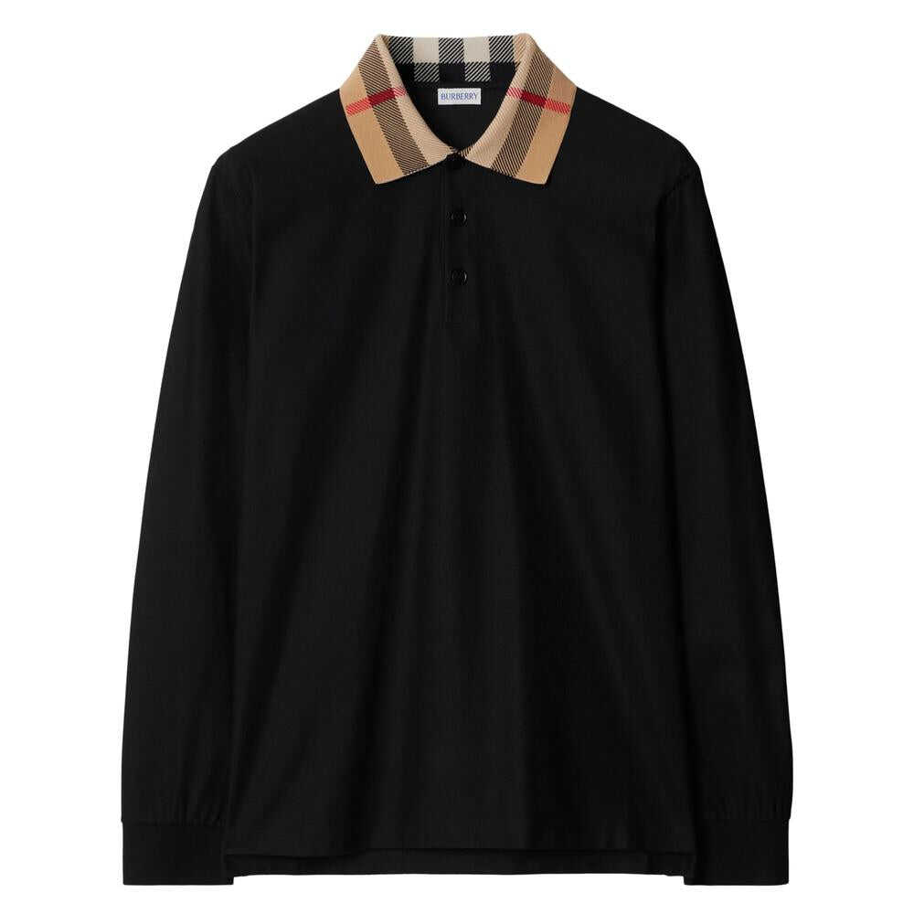 Black cotton piqué weave short front button fastening contrasting collar long sleeves ribbed cuffs straight hem
