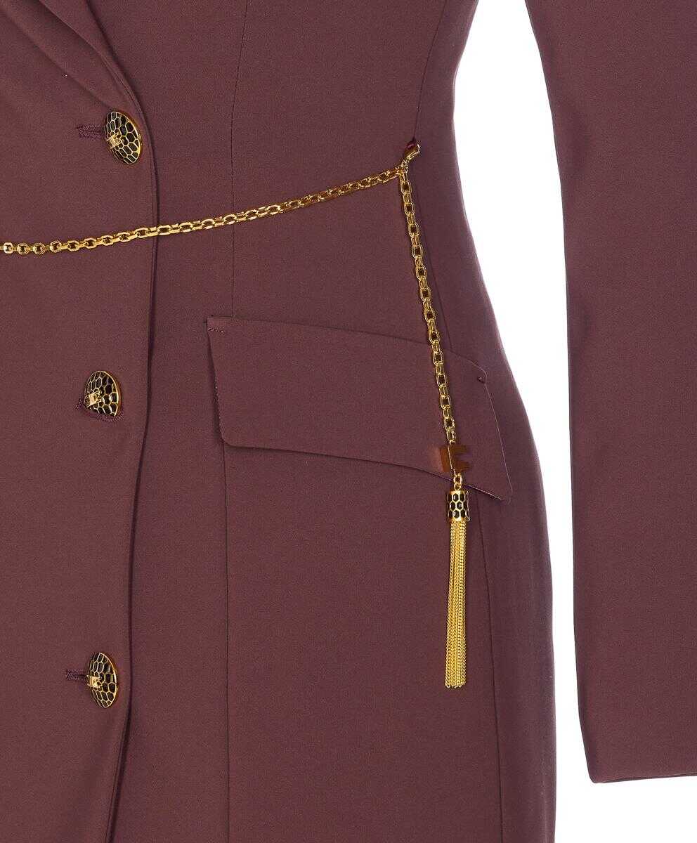 Elisabetta Franchi Merlot Double Breasted Buttons Dress, V-Neck, Reverse Detail, Long Sleeves, Midi Model, Reinforced Shoulder, Chain Detail, EU SIZE (IT)