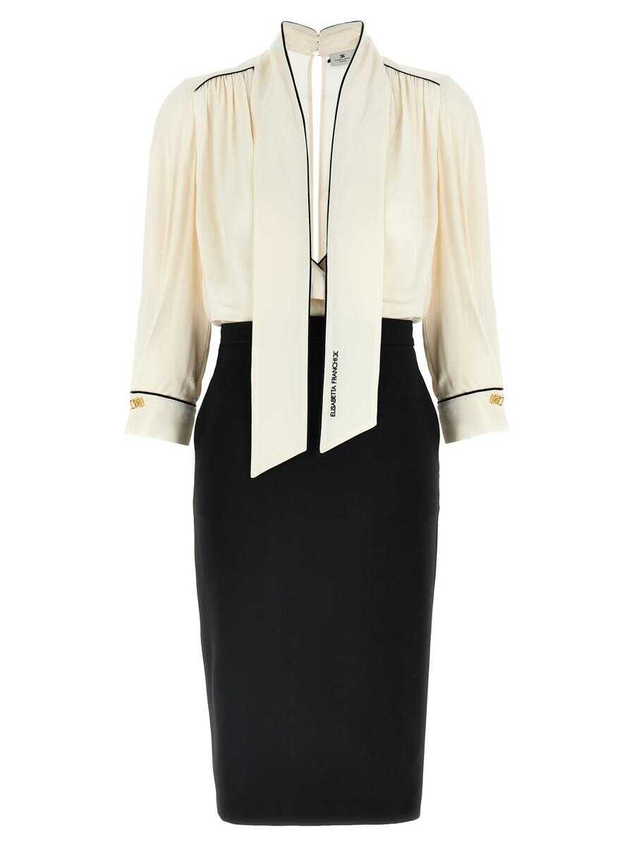 Two-piece dress with removable viscose georgette shirt, contrast piping, levalliére collar with hook closure, V-neck front and back, long sleeves with gold metal cuffs and cufflinks, crepe skirt, midi sheath skirt, pockets, zip closure and back split