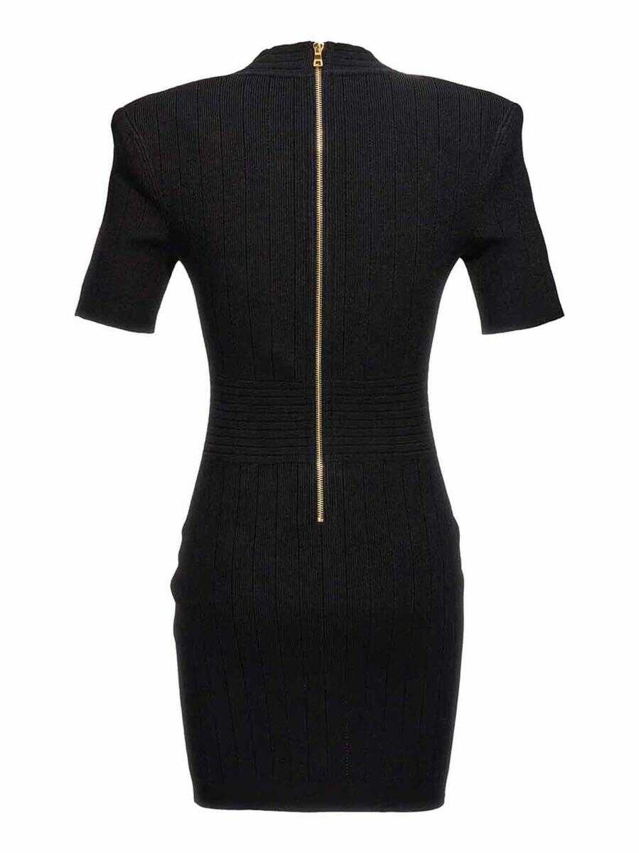 Ribbed knit dress, V-neck, padded shoulders, back zip closure, front 'Chiocciola' logo buttons and trompe-l'oeil pockets