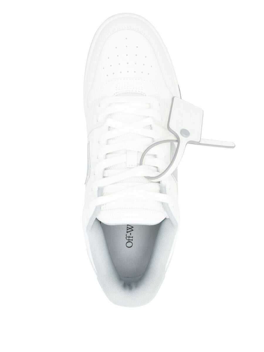 Off White Out Of Office Sneakers White/Grey/White Hybrid design with a '90s vibe that blends streetwear, basketball, and running elements, featuring a calfskin upper and a rubber sole.