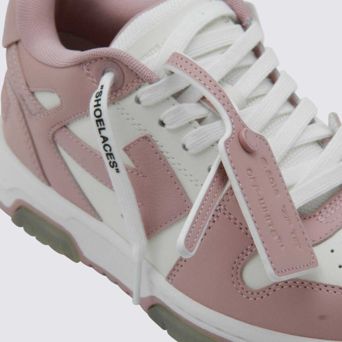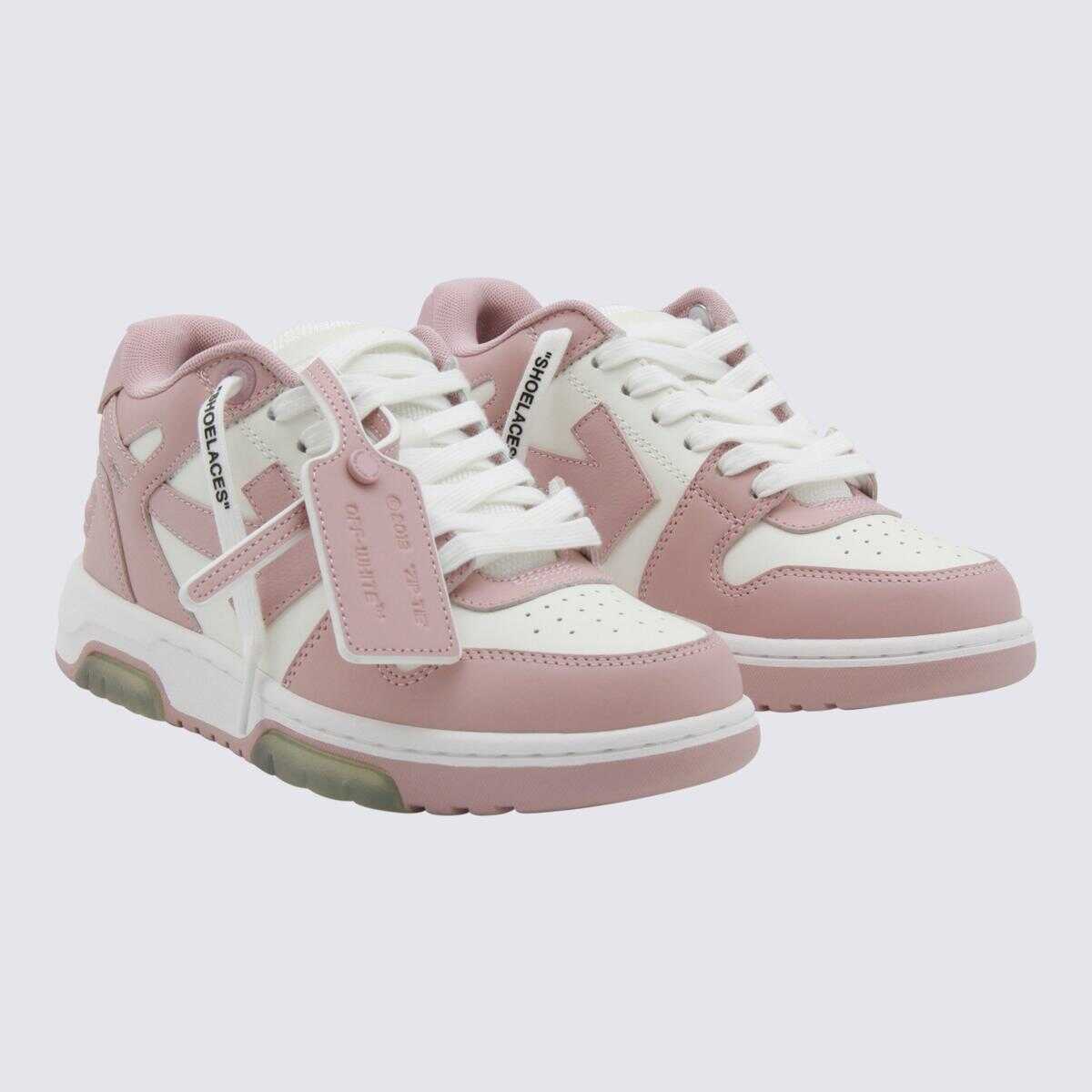 White and pink Out Of Office sneakers from Off-White featuring round toe, laces fastening, leather sole and arrow detail.