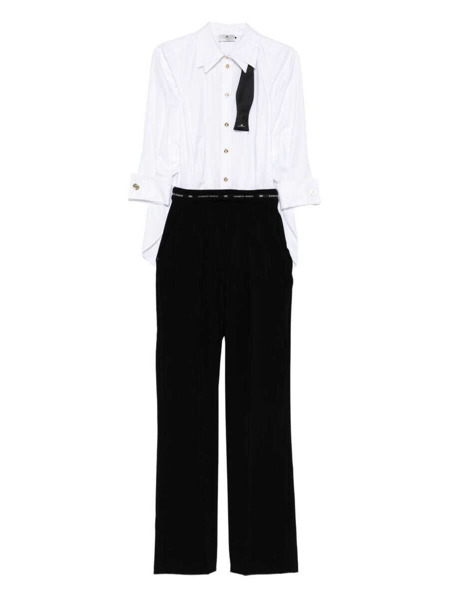 Elisabetta Franchi Dress with white bow, gold buttons, three-quarter sleeves, pleated trousers, logo belt Light gray calfskin suede, blue mesh panels, lace-up closure, gel cushioning, rubber sole