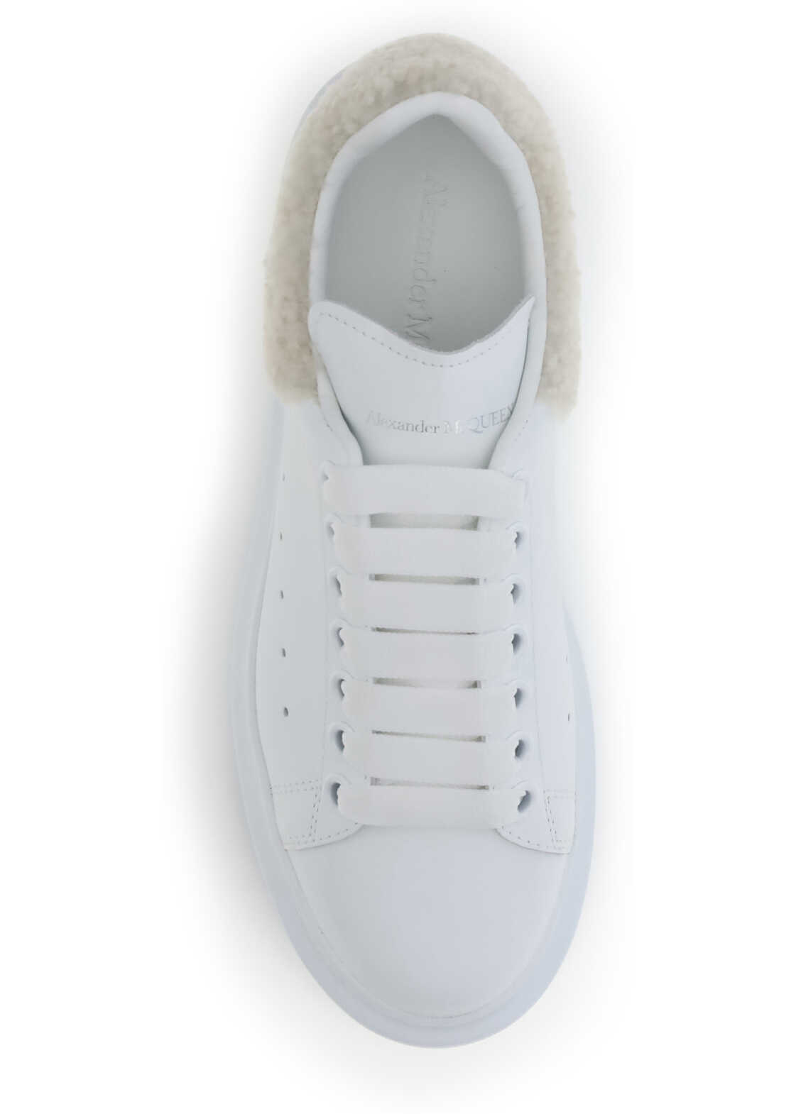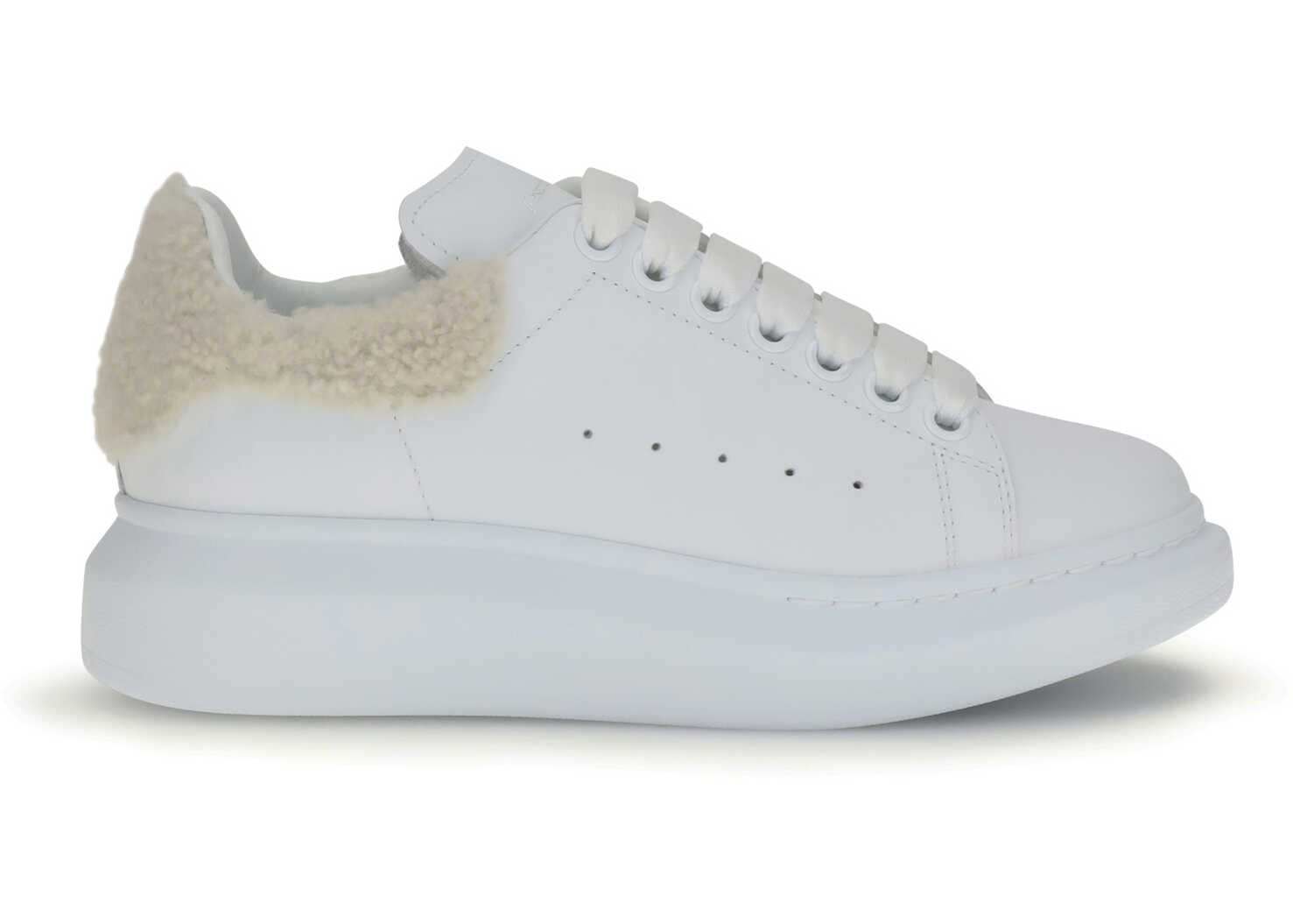 The Oversize Leather Sneakers by Alexander McQueen feature an iconic silhouette in white calf leather, with a beige bouclé heel accented by the McQueen signature. The thick rubber sole adds a bold, contemporary touch.