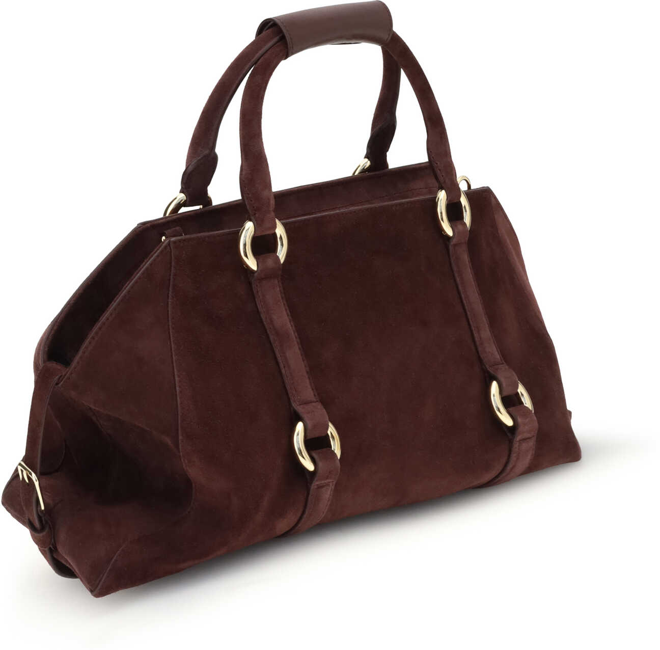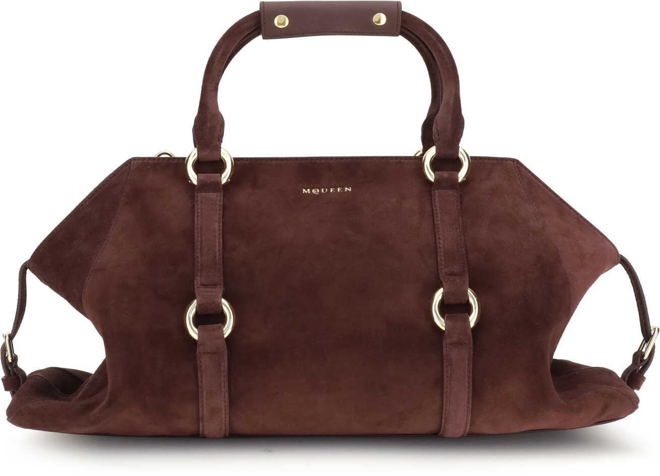 The Farringdon Bag by McQueen is named after the historic location of McQueen’s design studio and atelier. Its elongated silhouette in suede leather is accented with gold-tone metal details and a leather belt inspired by McQueen’s iconic Harness belts. Side buckle straps allow for adjustable capacity, and the bag can be carried by hand using the tubular handles or worn over the shoulder with the removable leather strap.
