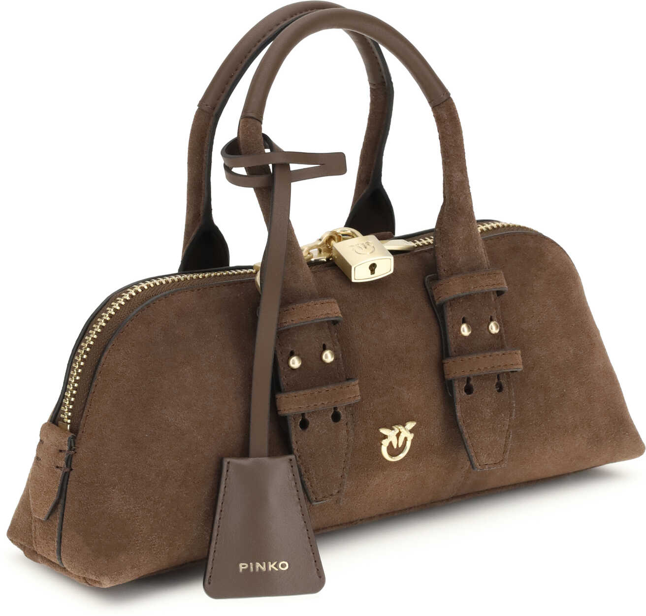The Bowling Baguette Bag by Pinko, crafted from suede leather, stands out with its rounded shape and the iconic Love Birds logo with a matching charm. Featuring a flat handle, a removable and adjustable shoulder strap, and a zip closure, it combines practicality with country-inspired elegance.