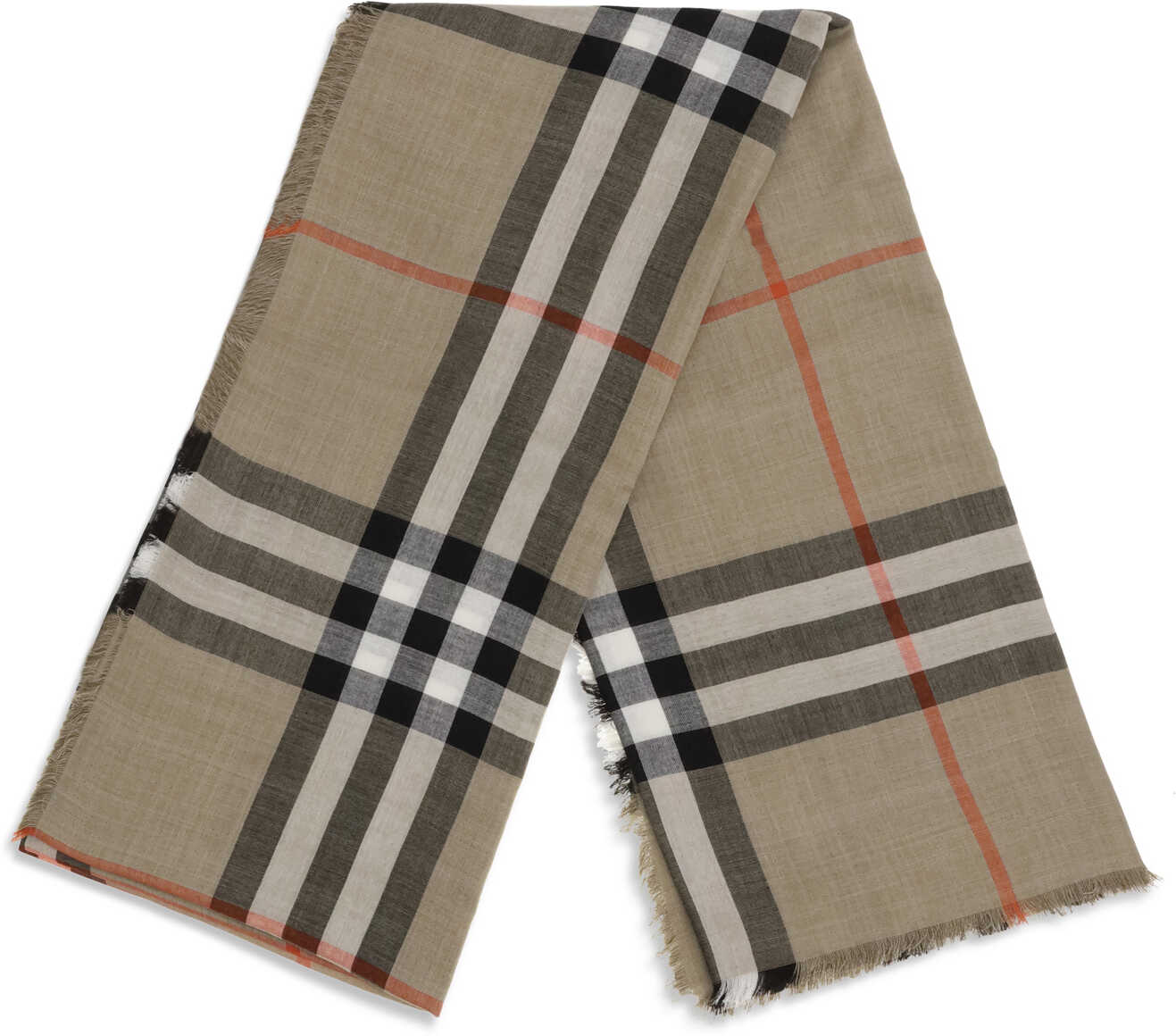 The Burberry Check Reversible Wool and Silk Scarf is crafted in lightweight muslin in Italy. This rectangular scarf features the Burberry Check print in seasonal sand and brown Vole tones, with short, delicate fringes along the edges, combining elegance and versatility.