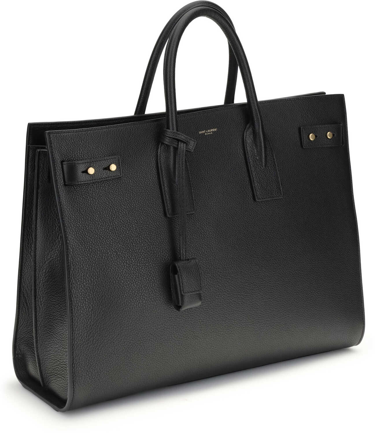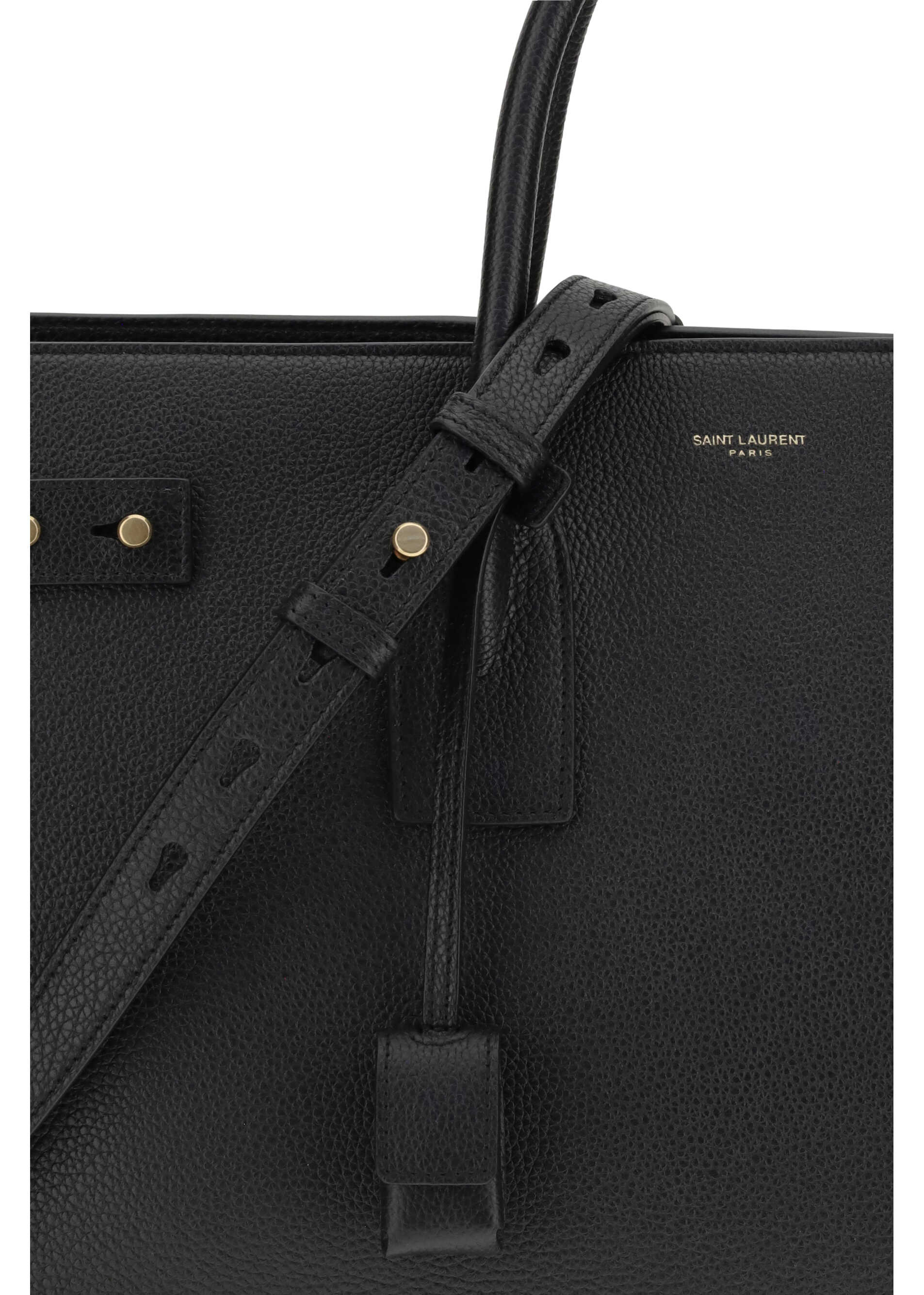 The Sac De Jour bag by Saint Laurent combines functionality and style with a soft structure, side gussets, and compression straps with tabs. It features round handles with a lock housed in a removable leather case and a removable, adjustable shoulder strap. The top opening reveals two main compartments separated by a removable zip pouch, while the suede lining and bronze-tone hardware complete the elegant design.