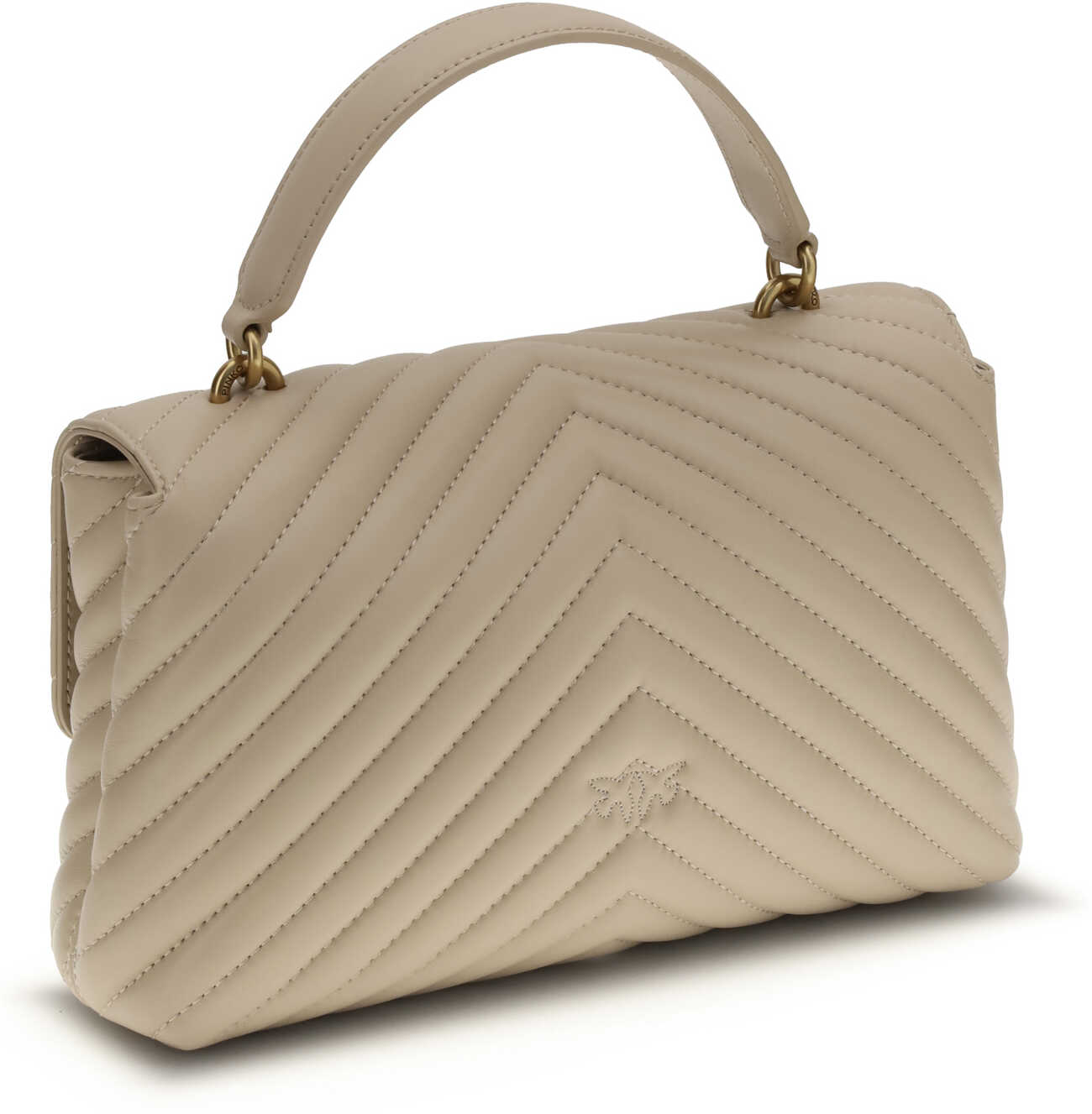 The Calfskin Love Lady Handbag by Pinko, front magnetic button closure, iconic gold-plated and embossed Love Birds logo on front, quilted and padded design, double interior compartment, sliding chain shoulder strap, flat rigid handle at top, interior flat pocket with zipper, iconic tone-on-tone embroidered brand monogram on back.