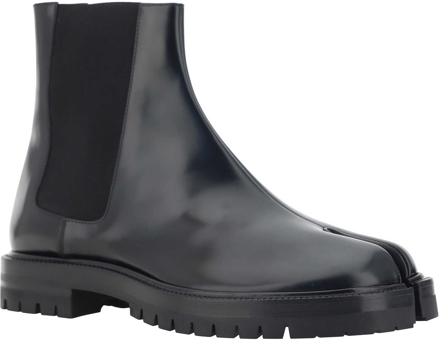 Calfskin Tabi County Chelsea Boots by Margiela, elasticized bands applied to side panels, slip-on block heel, iconic Tabi toe from the brand on the front, iconic contrast stitching on the back.
