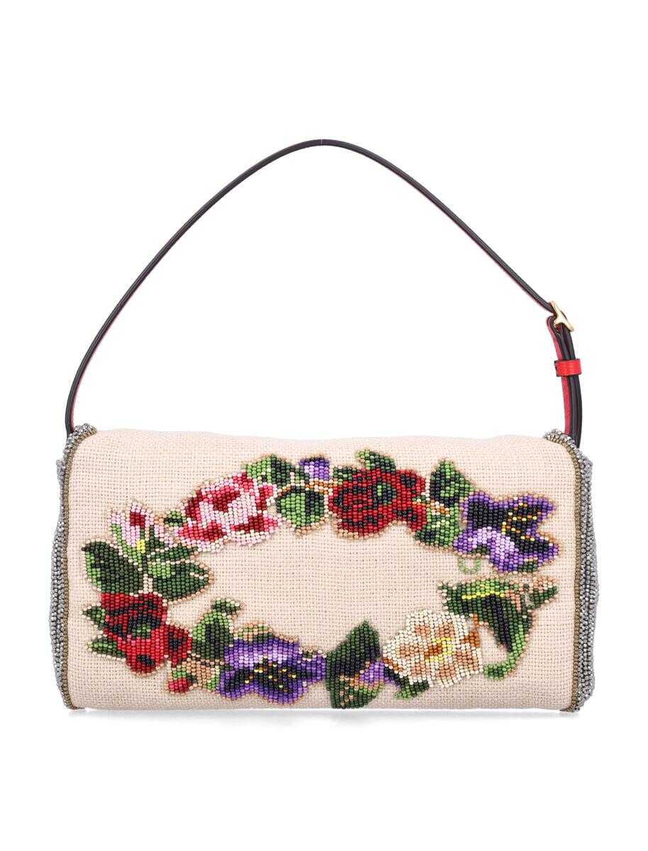Crafted from linen, it is adorned with beaded floral embroidery and a metallic VLogo Signature at the flap.