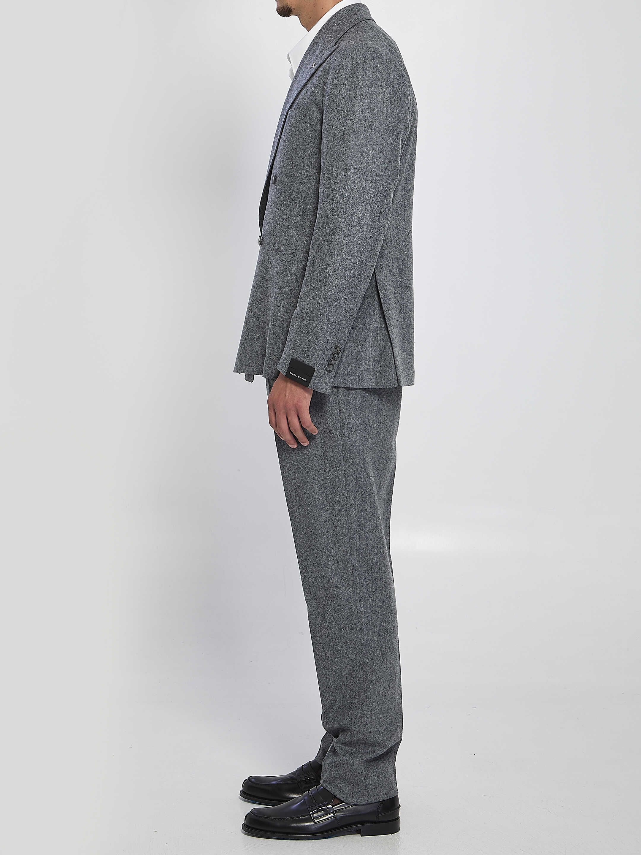 Two-piece suit in grey Super 100’s virgin wool flannel. The double-breasted jacket features classic lapels with a lapel pin, front button closure, two open front pockets, a welt chest pocket, and buttoned cuffs.