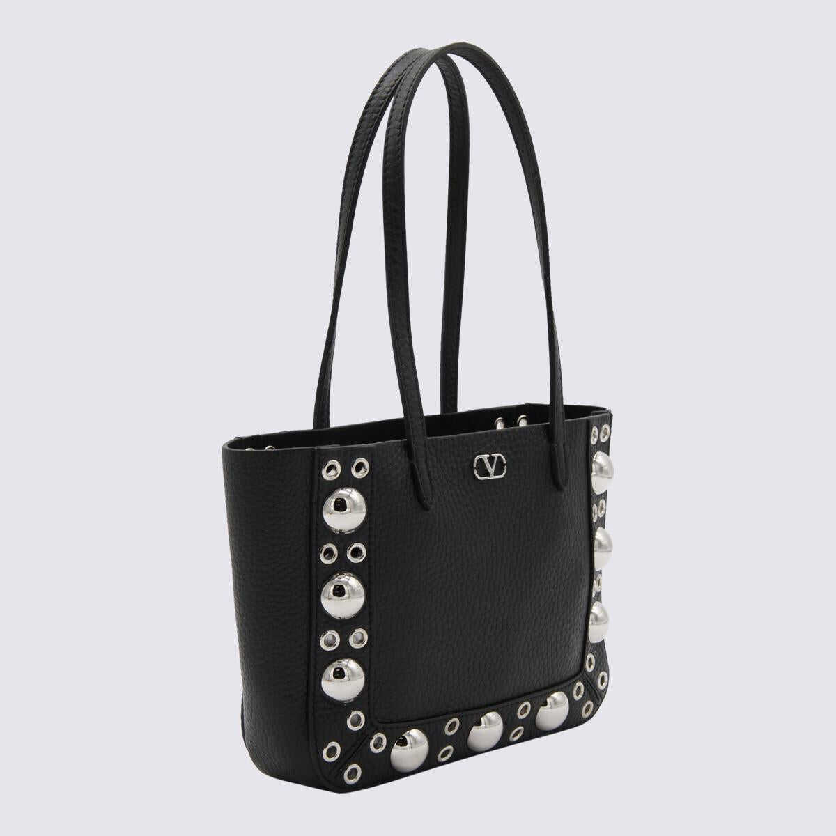 Black leather Nellcote totes from Valentino Garavani featuring top handles, frontal embroidered, logo, silver tone hardware and inside pocket.