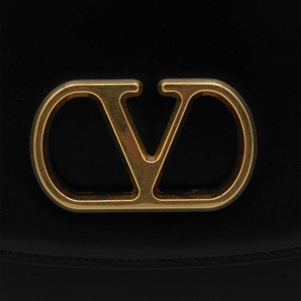 Black leather shoulder bag from Valentino Garavani featuring top handle, frontal fastening, gold tone hardware and inside pockets.