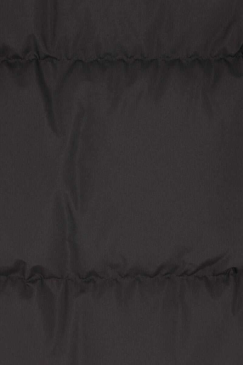 Burberry down jacket made of black nylon, featuring an Equestrian Knight Design patch on the sleeve. Designed with a high collar, detachable hood with Burberry Check pattern, double-zip front closure, zip pockets, long sleeves with elastic cuffs, and a straight hem with drawstring.