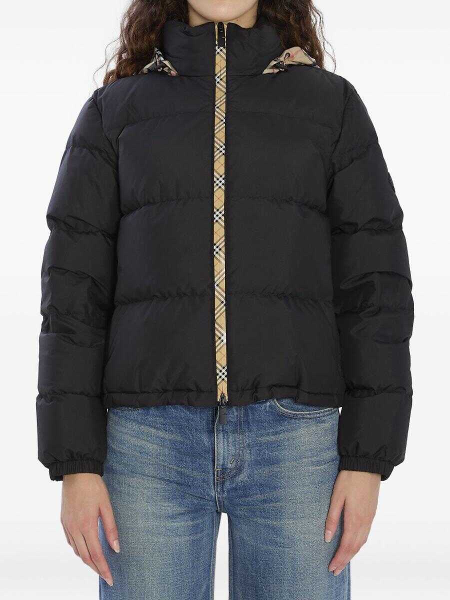 Burberry Black checked down jacket with hood, two-way zipper closure, side zipper pockets, drawstring hem, quilted design