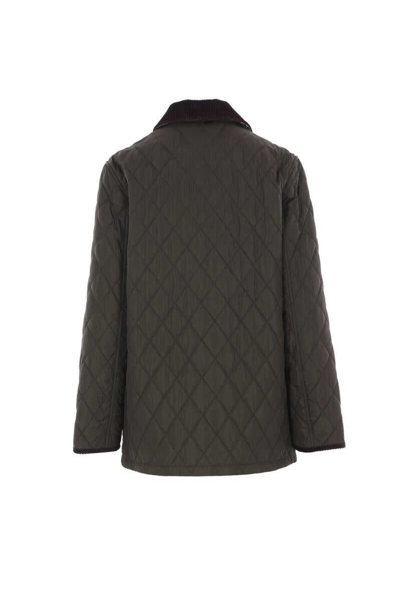 Burberry jacket crafted from dark green quilted nylon. Featuring a pointed corduroy collar, double-slider zip and snap button closure, front patch pockets, long sleeves, and a straight hem. The interior is lined in cotton with the Burberry Check pattern.