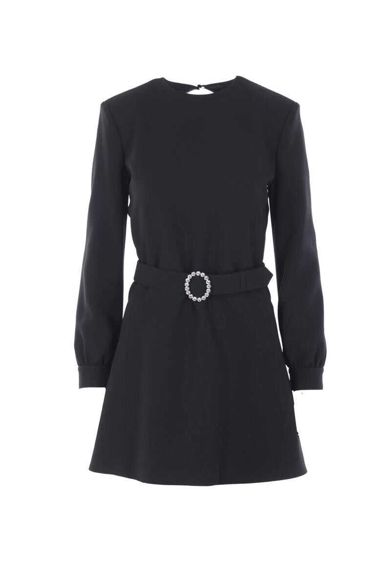 Saint Laurent mini dress crafted from black sablé. Featuring a round neckline, deep open back with button closure at the neck, invisible back zip fastening, matching belt with jeweled buckle, long sleeves, padded shoulders, and a flared skirt. Fully lined interior.