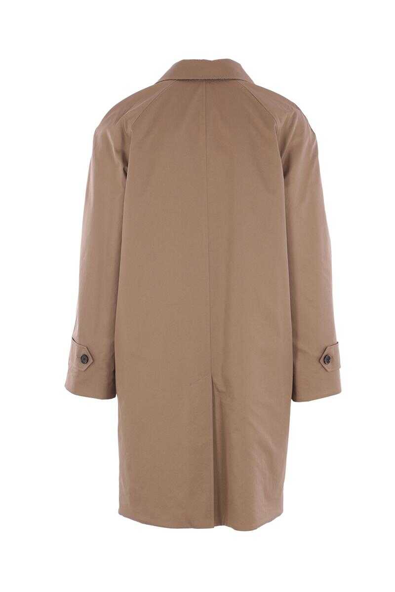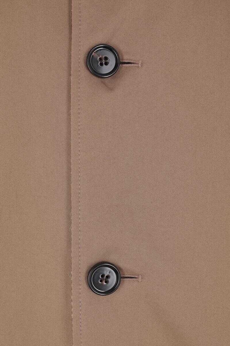 Burberry reversible coat made of clay brown cotton gabardine on one side and beige and brown chevron-patterned wool on the other. Featuring a pointed collar, front button closure, welt pockets with buttons, long sleeves with wrist tabs, and a center back vent.