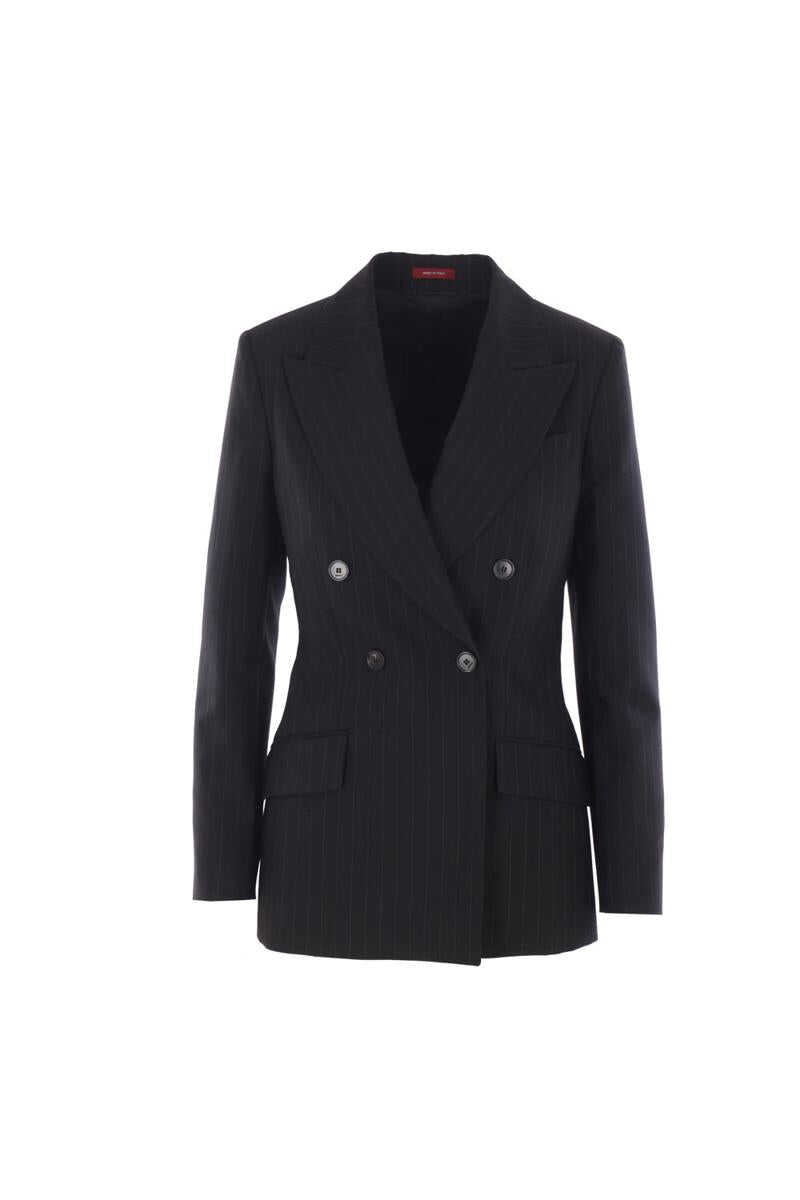 Gucci double-breasted jacket crafted from black wool with pinstripe pattern and all-over logo lettering in fil coupé. Featuring peak lapels, front button closure, padded shoulders, multiple pockets, long sleeves with buttoned cuffs, central back vent, and lined interior.