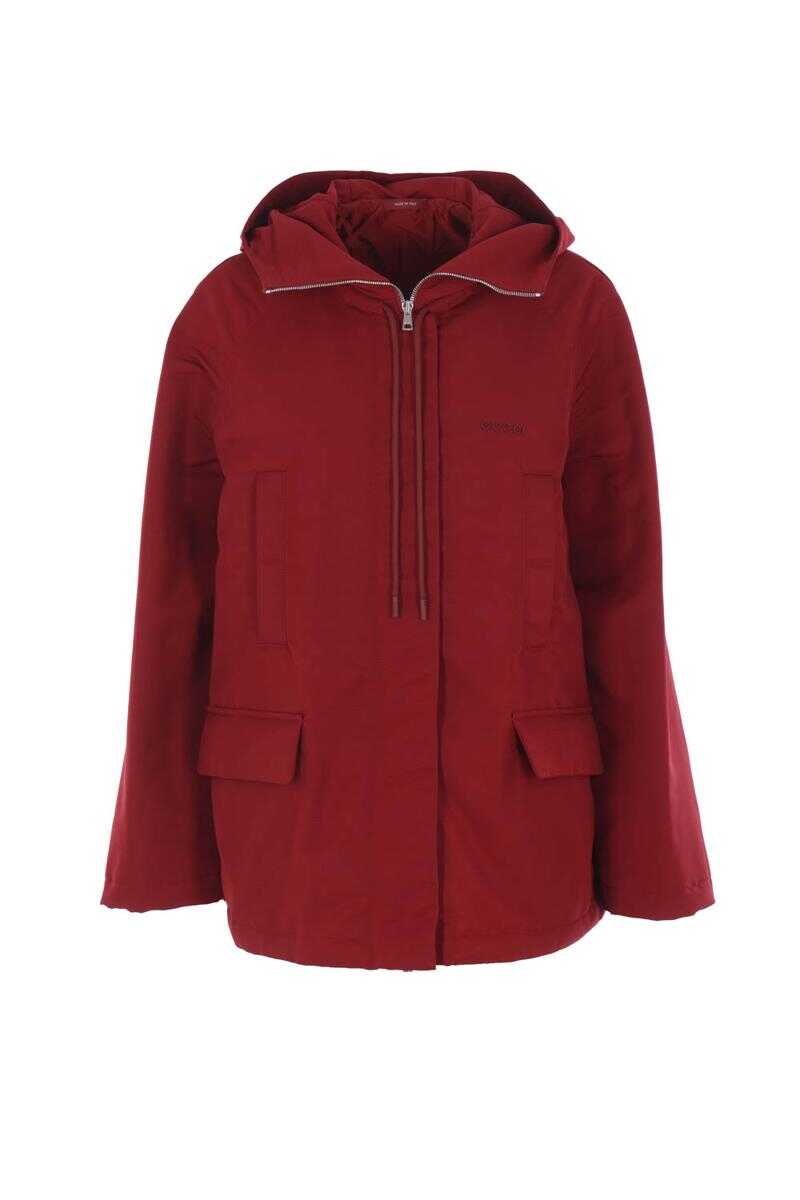 Gucci oversized padded parka crafted from burgundy nylon with metal logo lettering on the chest. Featuring a high collar, drawstring hood, double-zip/button closure, multiple pockets, long sleeves, and drawstrings at the waist and hem."