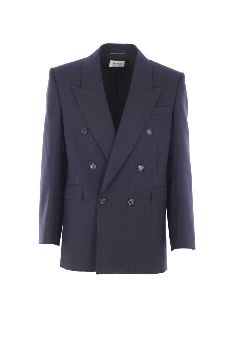 Saint Laurent double-breasted jacket crafted from blue wool. Featuring peaked lapels, front button closure, padded shoulders, multiple pockets, long sleeves with buttoned cuffs, side vents, and a fully lined interior.