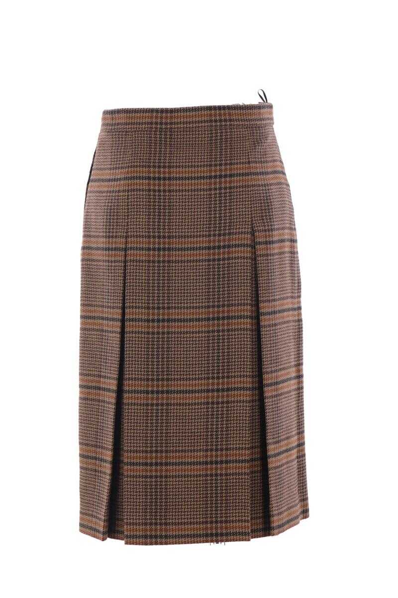 Saint Laurent midi skirt crafted from wool with a brown and beige Prince of Wales check pattern. Featuring an invisible side zip closure, concealed side pockets, inverted box pleat, and a fully lined interior.