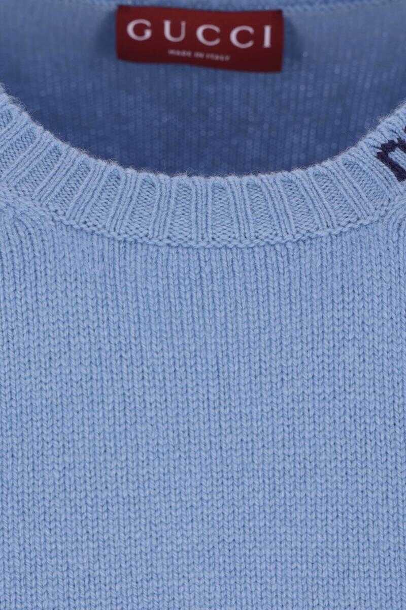 Gucci sweater crafted from light blue wool knit. Featuring a crew neckline with logo lettering intarsia, long sleeves, and ribbed trims.