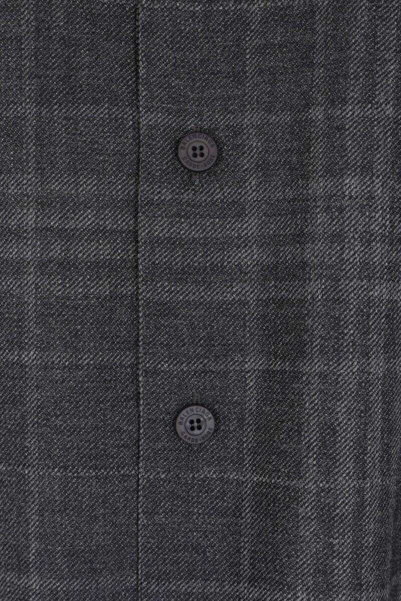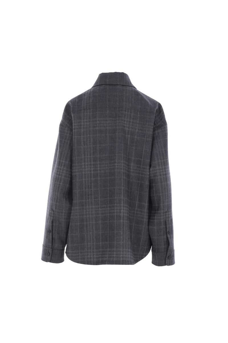 Balenciaga overshirt crafted from wool in a grey tartan pattern. Featuring a pointed collar, front snap-button fastening, welt pockets, long sleeves with buttoned cuffs, and a rounded hem. Fully lined interior.