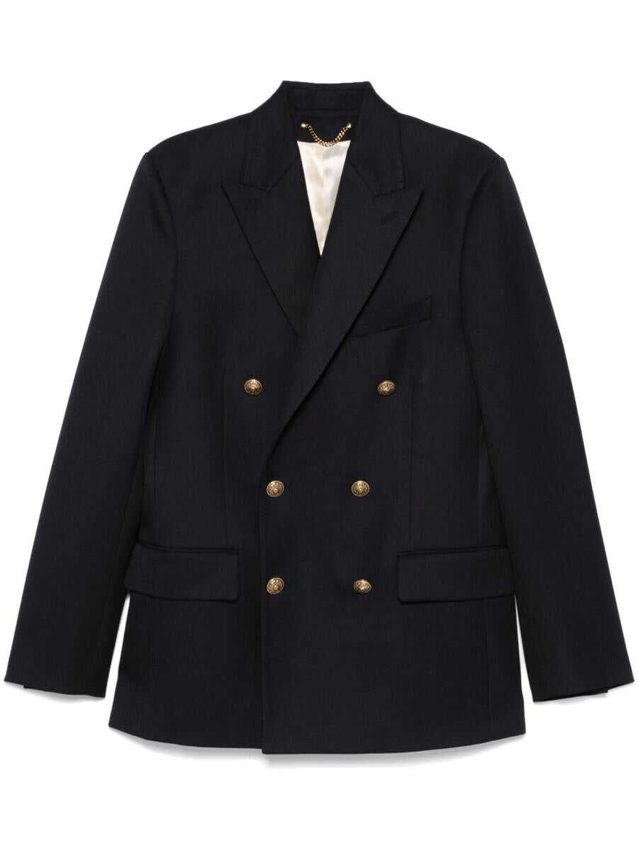 dark blue double-breasted button fastening embossed gold-tone buttons logo patch at the sleeve peak lapels two front flap pockets chest welt pocket buttoned cuffs English rear vents