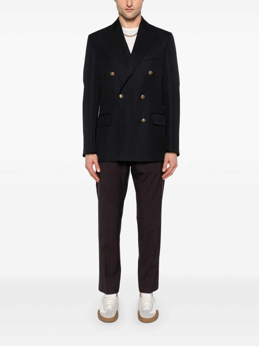 Golden Goose Dark blue double-breasted jacket with button closure, embossed gold buttons, logo patch on the sleeve, peak lapels, two front flap pockets, chest welt pocket, buttoned cuffs, and rear vents.
